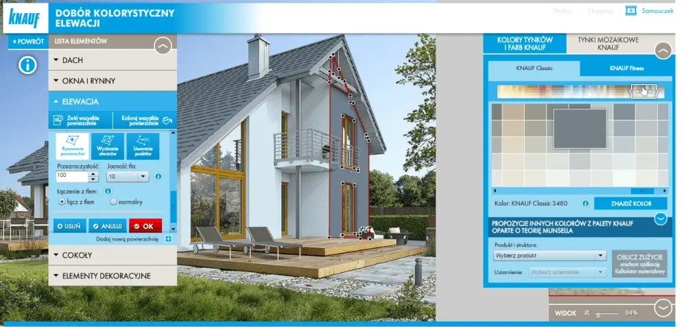 Jeśli obawiasz się, że wybrany na elewację kolor w rzeczywistości wcale nie będzie dobrze wyglądał, warto wcześniej to sobie zwizualizować. Pomocna może okazać się aplikacja ,,Dobór kolorystyczny elewacji” dostępna na stronie www.knauf.pl (strefa dla inwestora). Wystarczy wstawić zdjęcie swojego domu, a za pomocą znajdujących się tam narzędzi sprawdzić, które kolory najlepiej wyglądają i do dzieła!