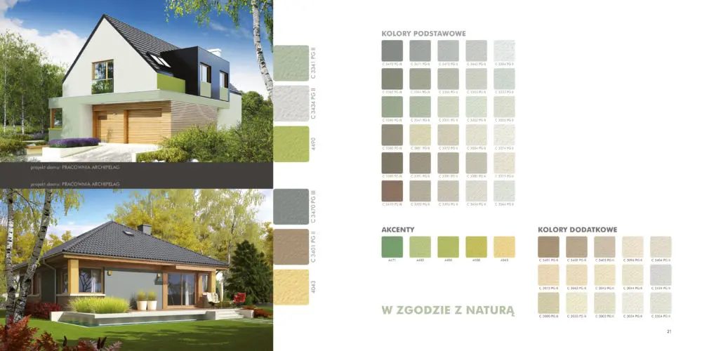 Ta propozycja obfituje w zielenie, szarości oraz beże więc jest idealną propozycją dla wszystkich miłośników przyrody i spokojnego trybu życia. Idealnie wpisze się w tradycyjną, jak i nowoczesną architekturę. Ta paleta najlepiej wkomponuje się w domostwa położone nieopodal lasów, łąk, parków i jezior. Butelkowa zieleń, która może stanowić akcent kolorystyczny na elewacji, jest jednym z najmodniejszych kolorów w 2017 roku.