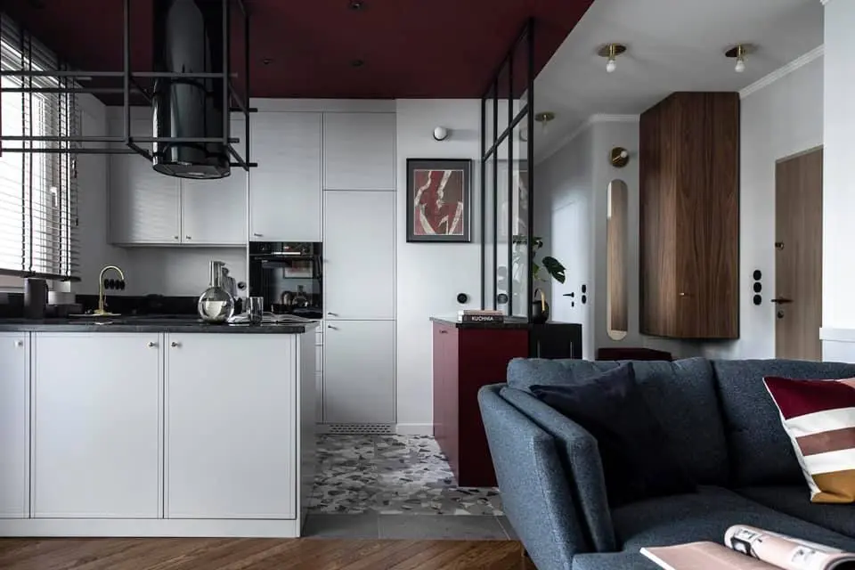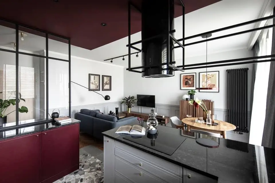 Ciekawe kontrasty, wysokiej jakości produkty oraz kunszt architekta to sposób na niebanalną, nietuzinkową aranżację wnętrza. W tym mieszkaniu w kuchni sufit w kolorze marsala ciekawie współgra z czarnymi elementami industrialnymi oraz z jasno szarą kuchnią. Na podłodze znajdują się kafle imitujące lastryko, które łączą się z drewnianą podłogą ułożoną w jodełkę. Ten sam motyw płyt podłogowych znajduję się w przedpokoju przy drzwiach wejściowych.