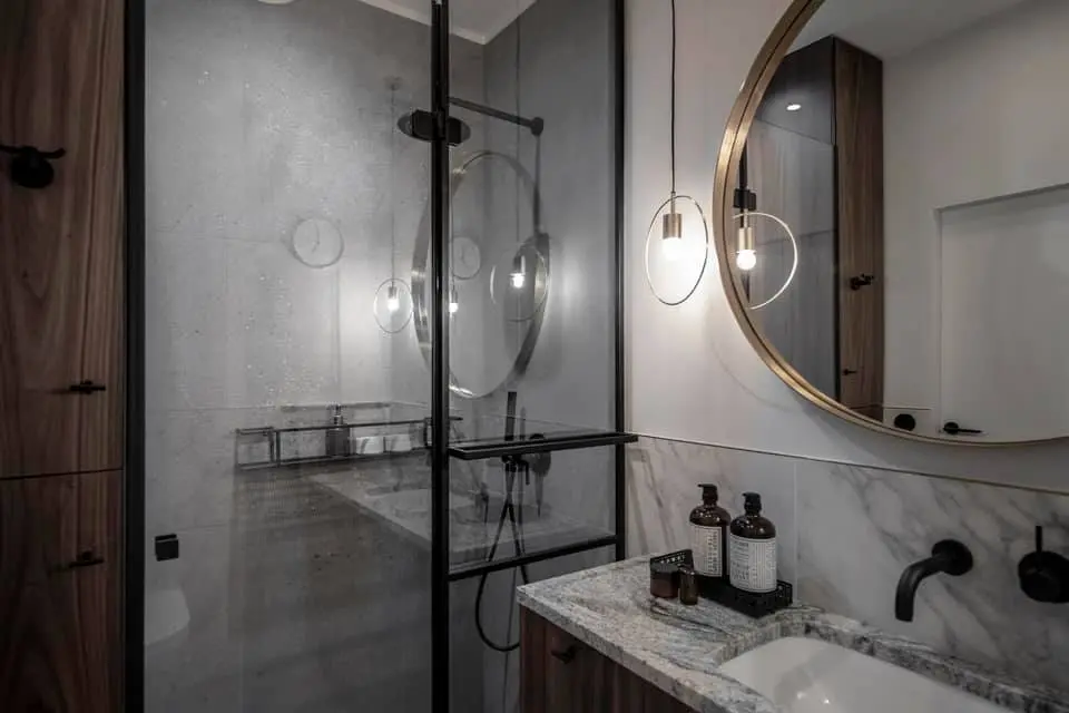 W tak stylowym mieszkaniu nie mogło również zabraknąć klimatycznej łazienki, w której drewniane elementy podkreślają jej wyjątkowy styl. Szarości, drewno oraz delikatne złote motywy nadają stylowej przytulności pomieszczeniu.
