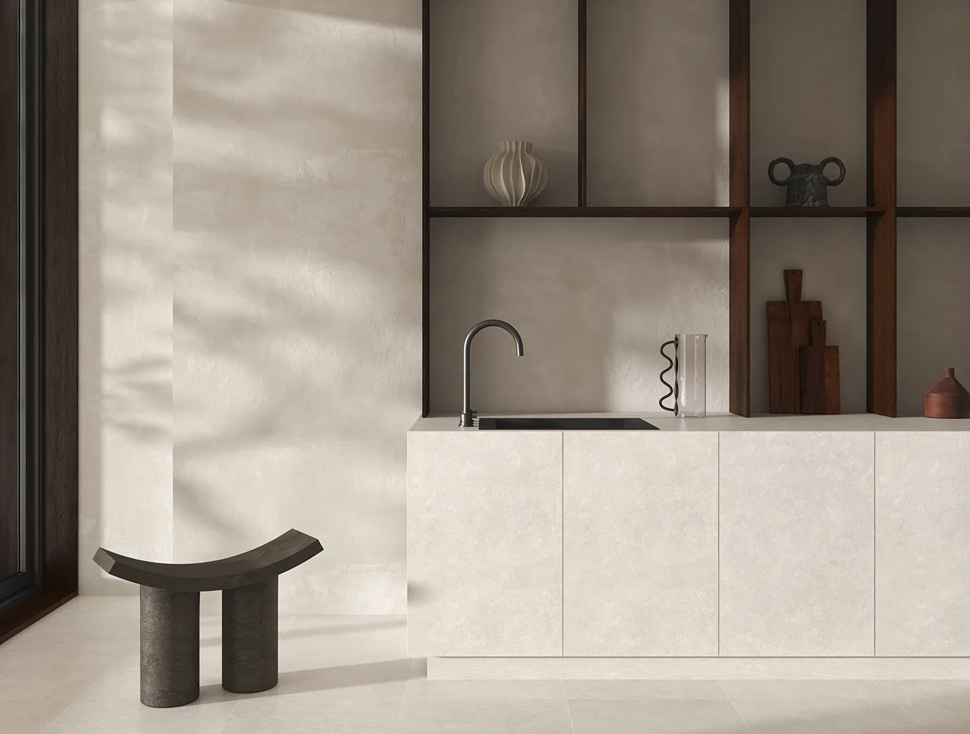 Wyspa ze zintegrowanymi szufladami i zlewozmywakiem wykonana z płytek wielkoformatowych w projekcie Dwa Concept