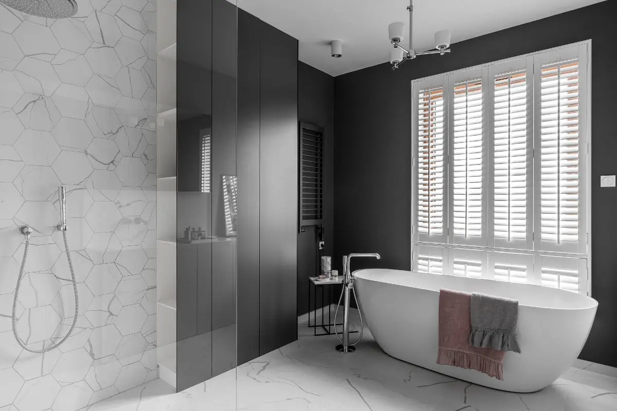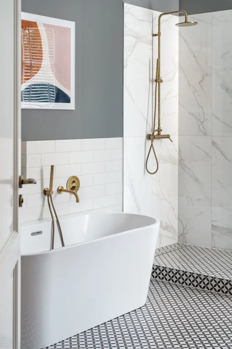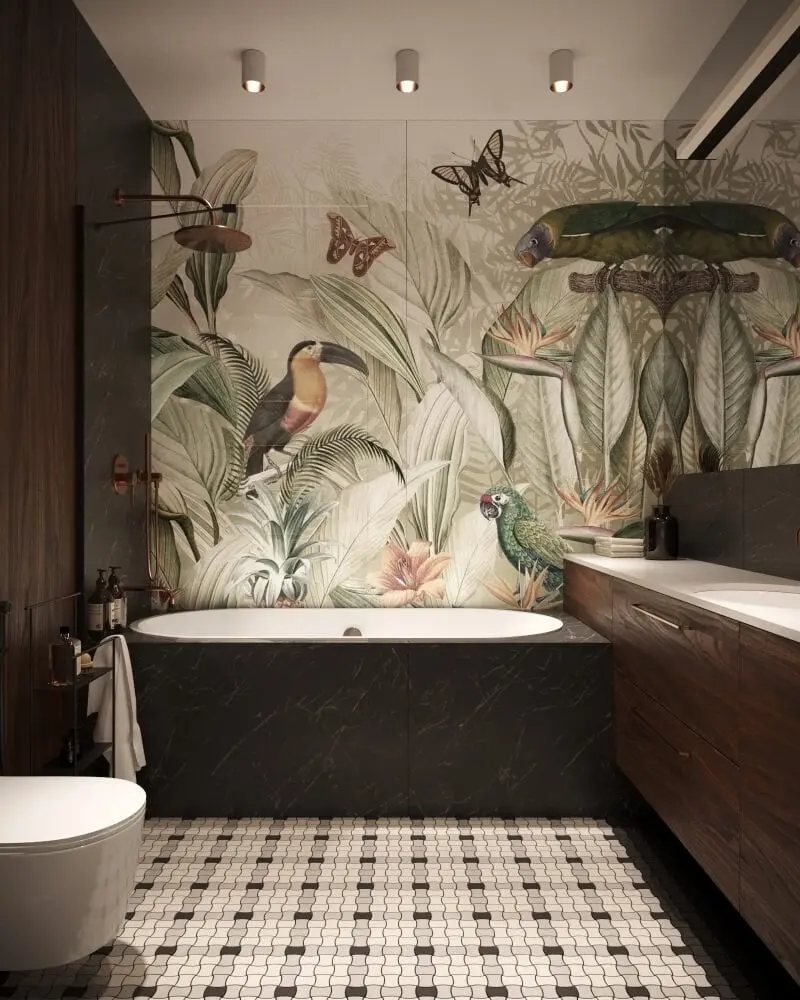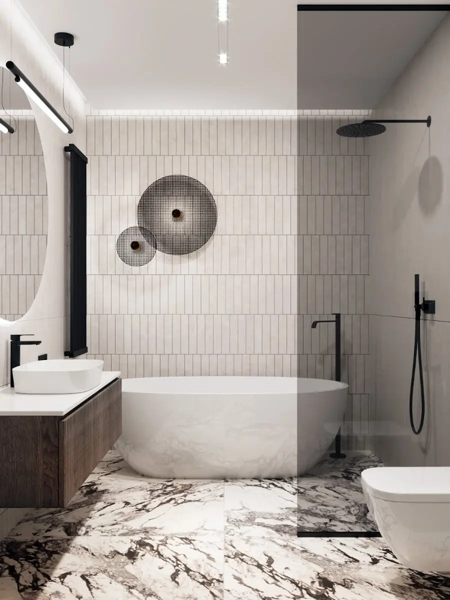 Obok swoje miejsce znajduje wanna wolnostojąca lub – jeśli nie mamy miejsca – przyścienna. Biżuterią wnętrza są nie tylko płytki, które możemy wykorzystać w aranżacji ścian i podłóg, ale również tapety oraz armatura a także inne elementy wyposażenia mogące pełnić rolę dekoracji, jak np. designerski grzejnik, lustro czy oświetlenie.