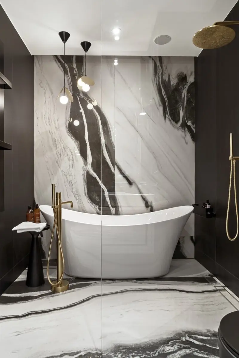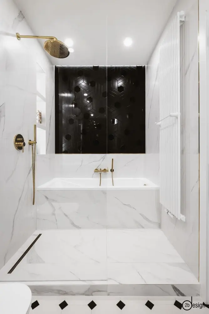 Poniższe projekty ukazują różne pomysły na umiejscowienie wanny i prysznica, co jest oczywiście uzależnione od kształtu i metrażu pomieszczenia. Jak widzimy najczęściej w tego rodzaju aranżacjach pojawia się odpływ liniowy, który pozwala nie tylko stworzyć harmonijne wnętrze, ale też stwarza atmosferę luksusu i wyciszenia.