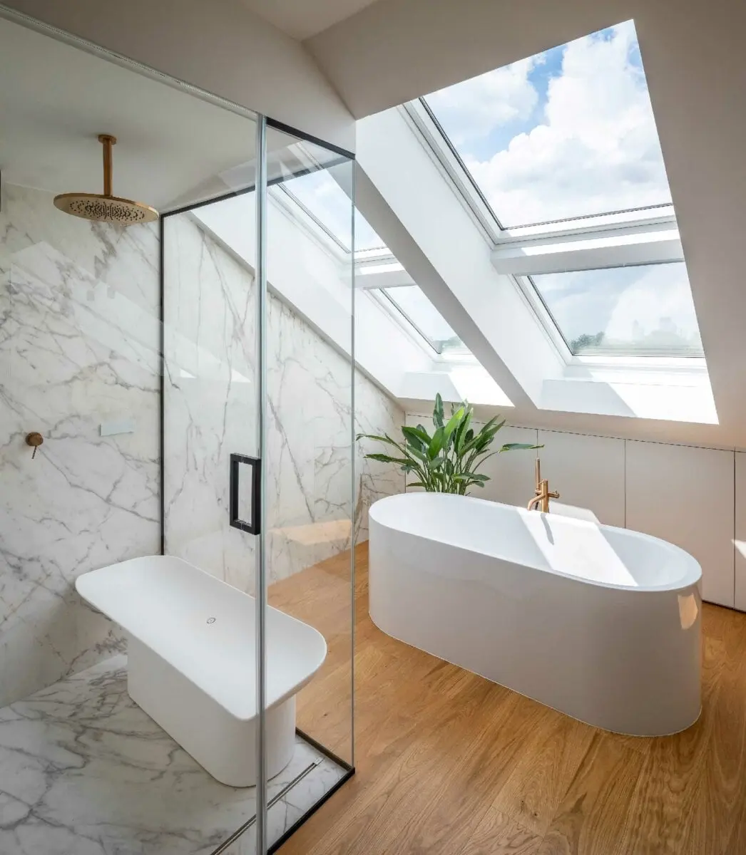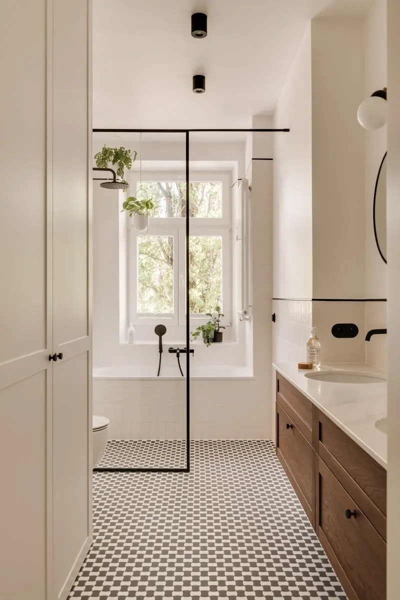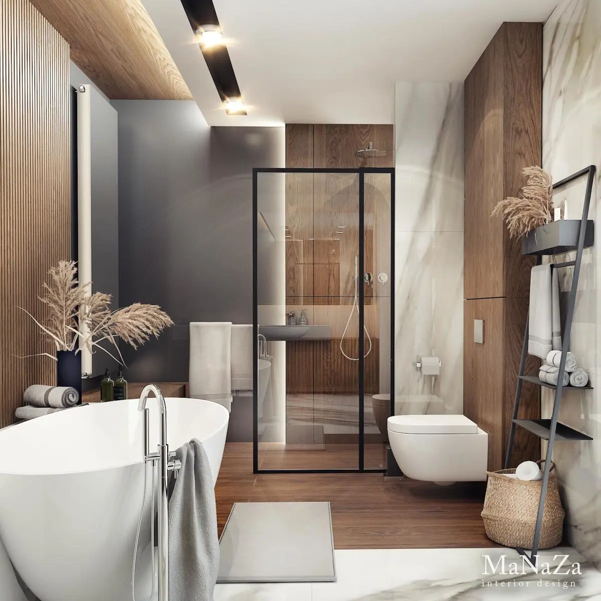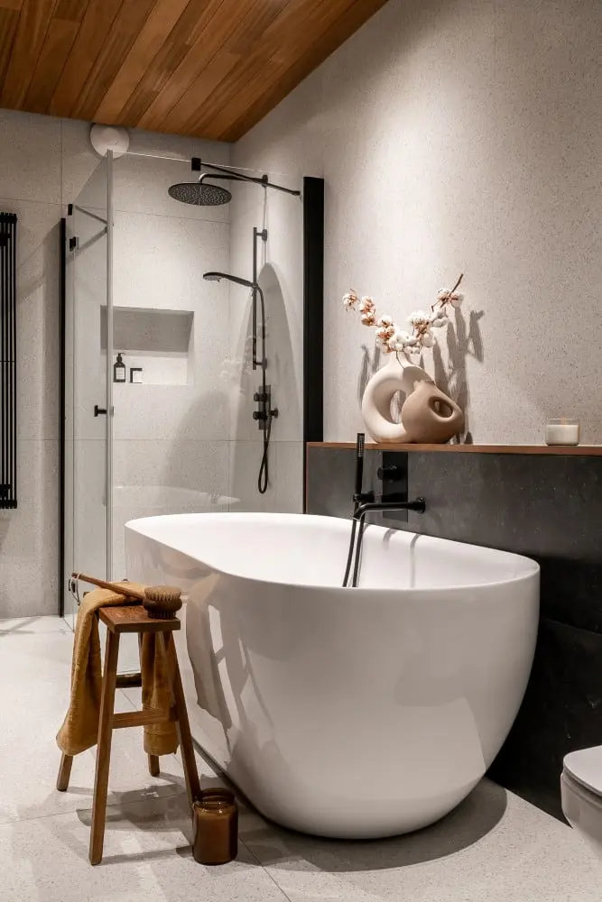 Zintegrowana strefa prysznicowa i kąpielowa za szkłem