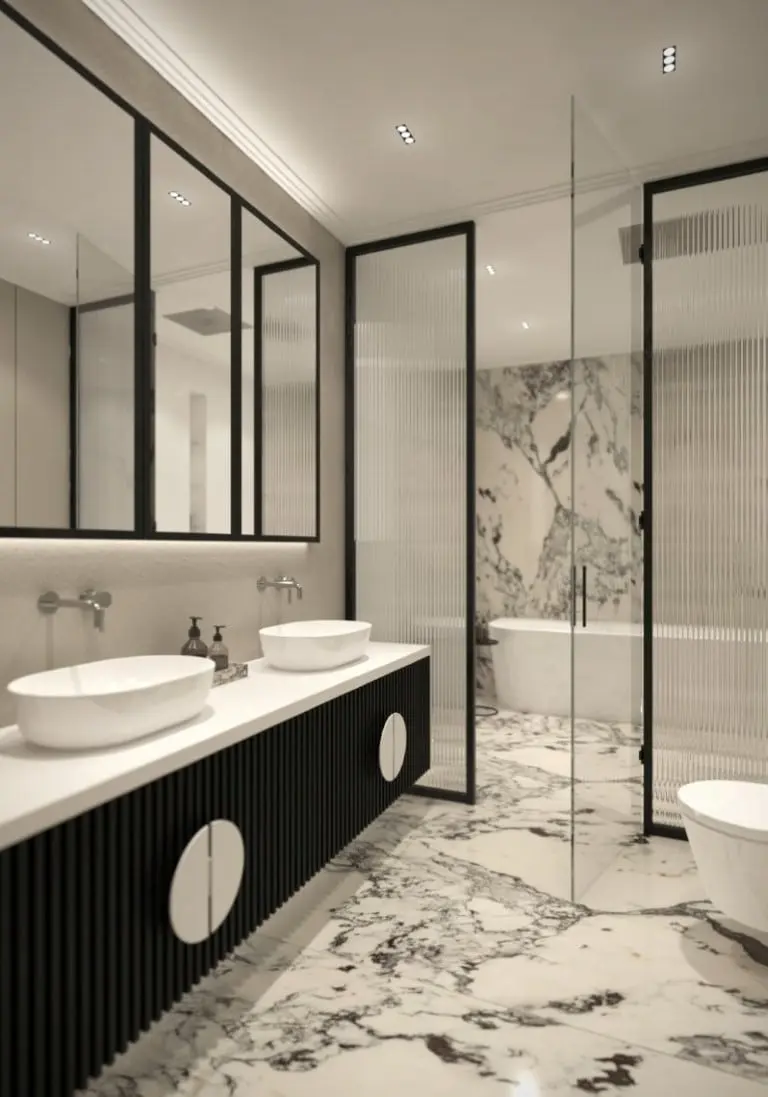 Coraz częściej spotykanym rozwiązaniem, które naszej redakcji bardzo przypadło do gustu, jest zintegrowana strefa kąpielowa i prysznicowa, oddzielona od reszty pomieszczenia szkłem. W zależności od stylu wnętrza, może przyjąć bardzo minimalistyczną, wręcz prawie niewidoczną formę, albo loftową, czyli „udekorowaną” czarnymi metalowymi ramami. Architekci coraz częściej wykorzystują w tym celu również szkło ornamentowe.