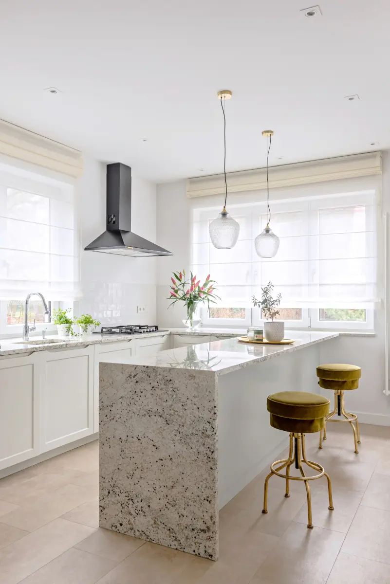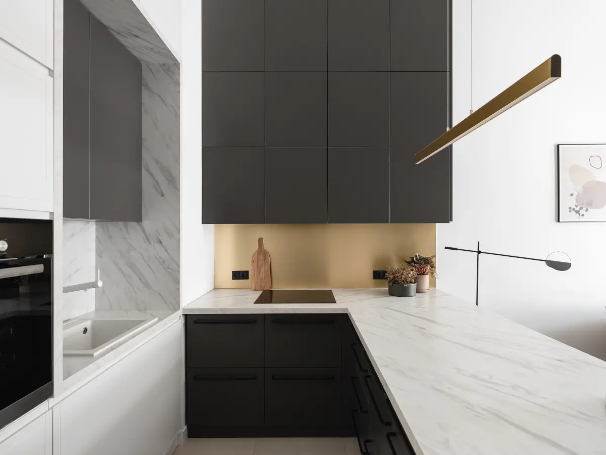 Dzisiejsze kuchnie coraz bardziej emanują elegancją i luksusem. Jasne barwy blatu z beżowym żyłowaniem i złoto to połączenie idealne. To sposób na niewymuszoną elegancję, podaną w sposób lekki i bezpretensjonalny. Możemy także pokusić się o większą ekstrawagancję. Co powiecie na to, aby niektóre fronty szafek były złote? Wygląda to niezwykle elegancko i sprawdzi się przede wszystkim w kuchniach otwartych na salon.