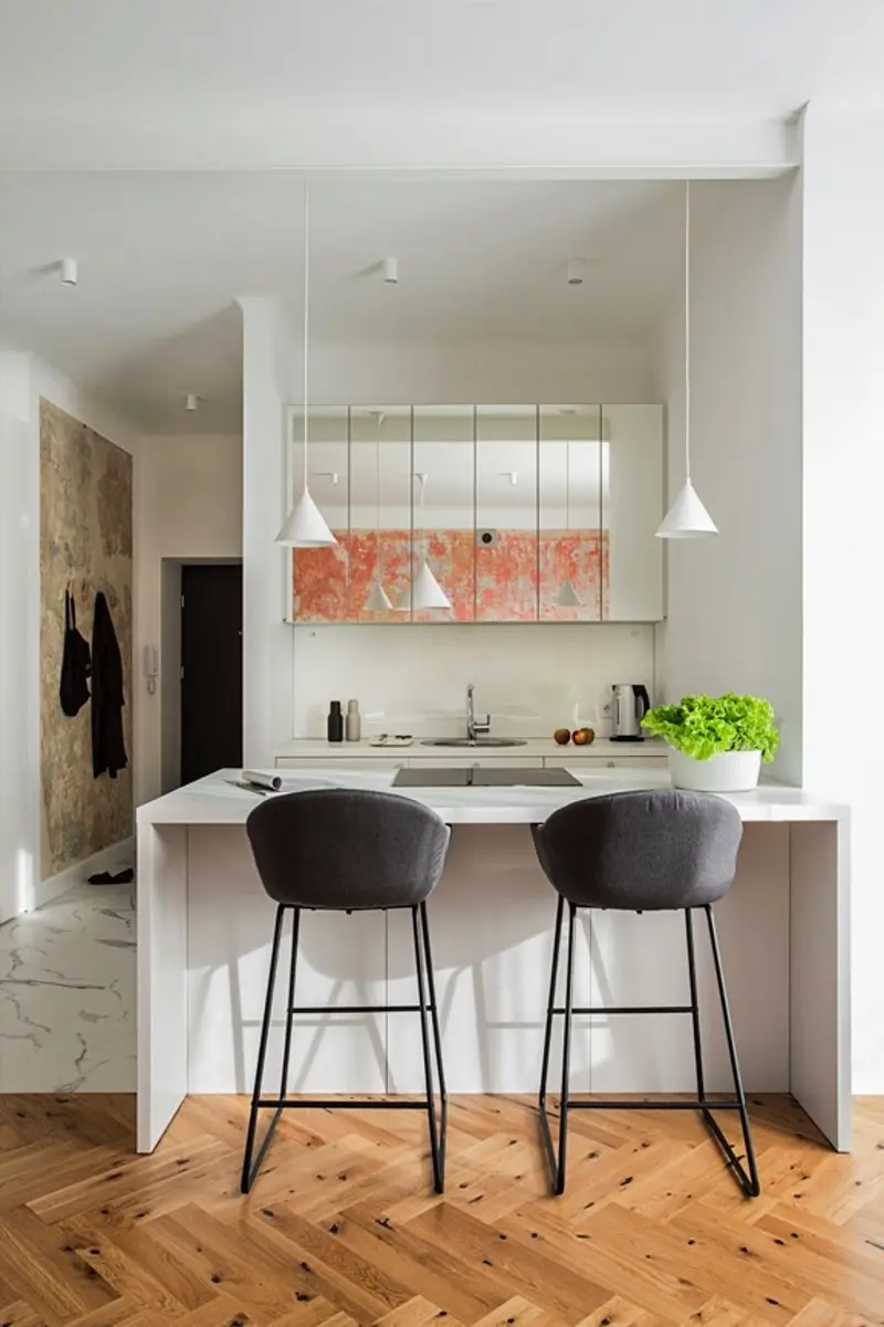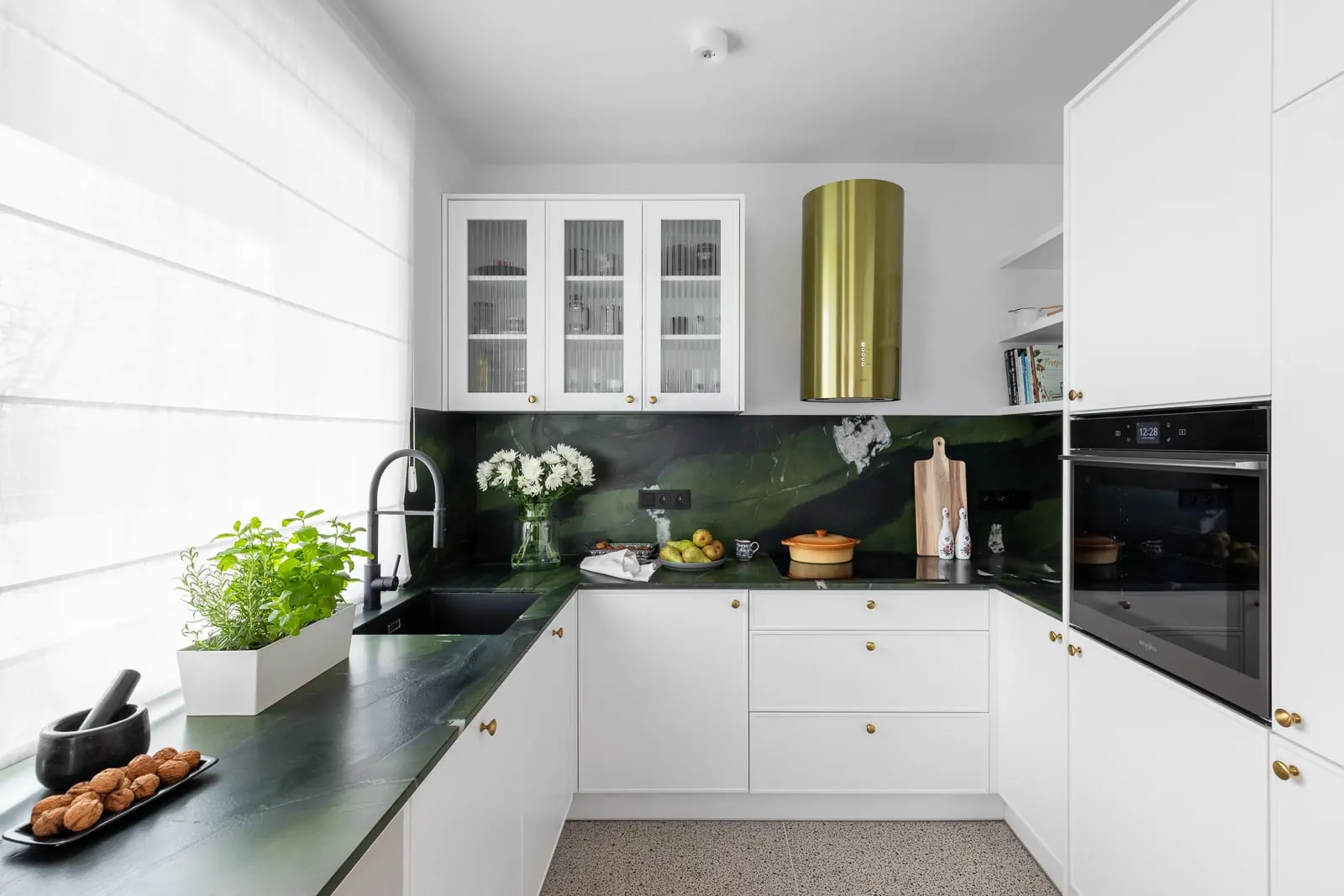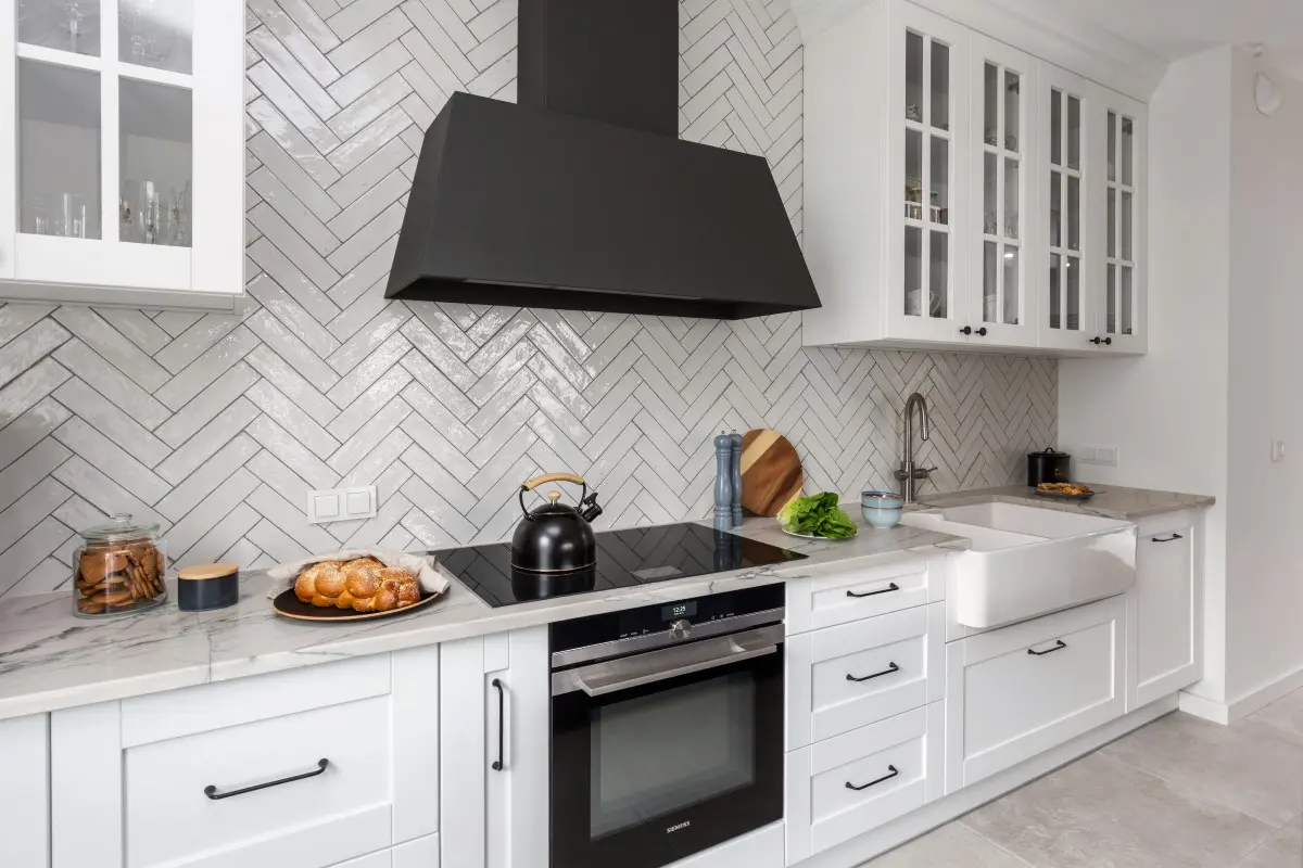 To tu doskonale sprawdzą się gładkie fronty – często wykonane z lakierowanego mdf-u. Blat może być zrobiony z drewna, albo kamienia. Nie ma tu mowy o niezliczonej ilości kolorów. Trzy barwy to absolutne maksimum. Jeszcze większą harmonię wprowadzą sprzęty agd pod zabudowę.