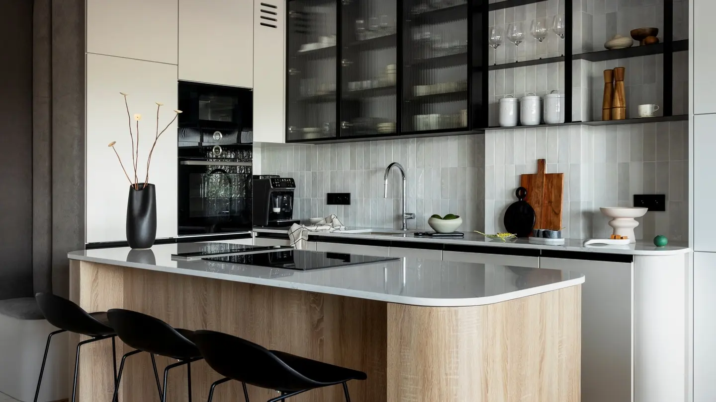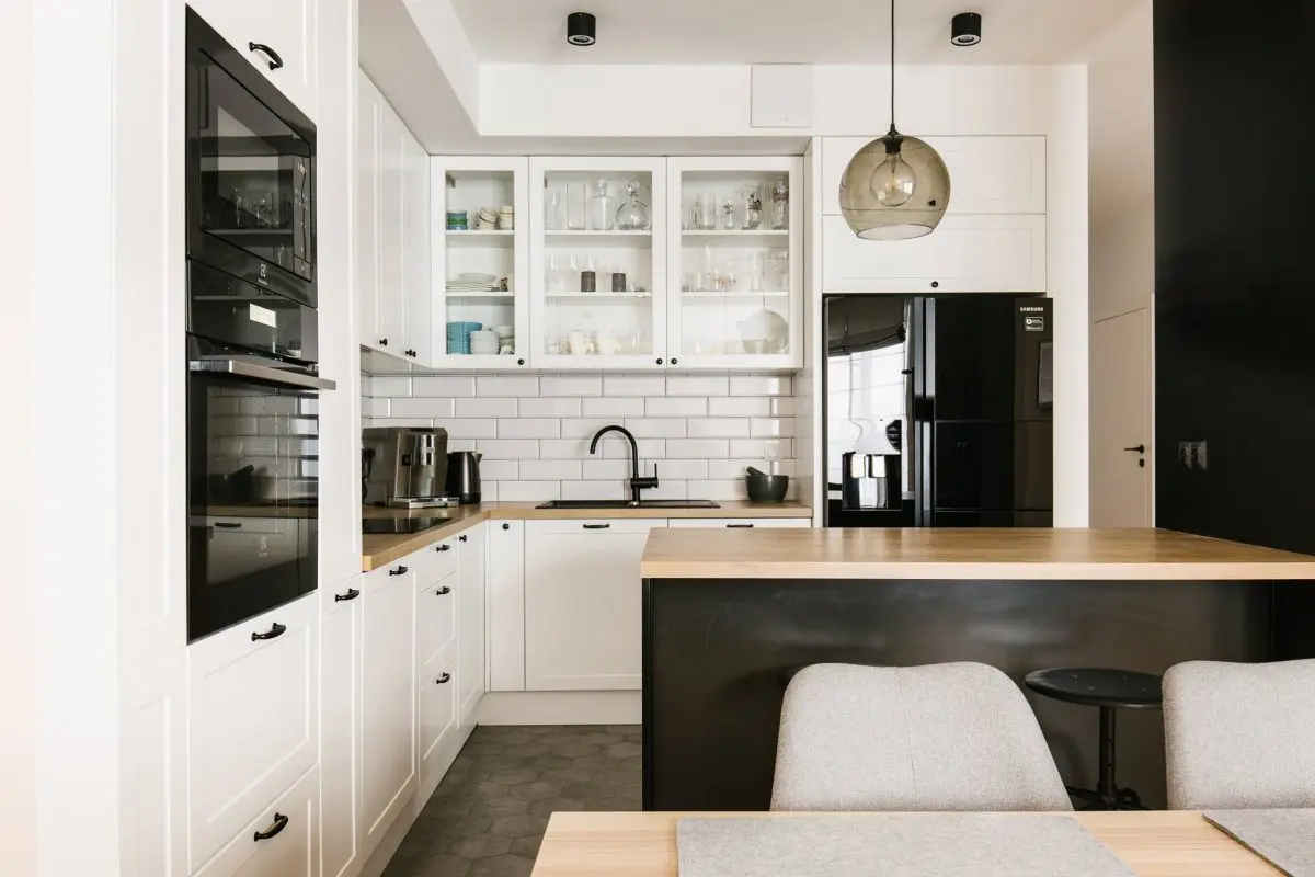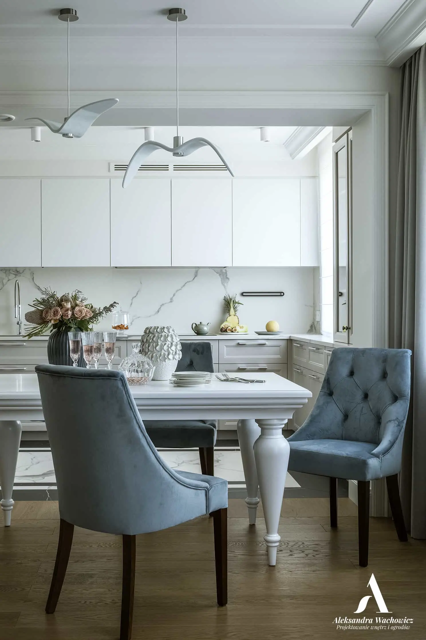 Czarne szafki połączone z białym blatem i jasnymi krzesłami mogą stworzyć bardzo spójną przestrzeń. Kontrastowe barwy nadają wnętrzu wyrazu, sprawiając, że kuchnia wygląda bardzo schludnie. Dla przełamania sterylności białej palety kolorystycznej, możemy pokusić się o kontrastowe uchwyty, lub ciemną zabudowę górnych szafek. Dzięki takiemu połączeniu stworzymy kuchnię odporną na sezonowe mody. Jeśli dodatkowo otworzymy ją na salon, zyskamy harmonijną i bardzo reprezentacyjną przestrzeń.