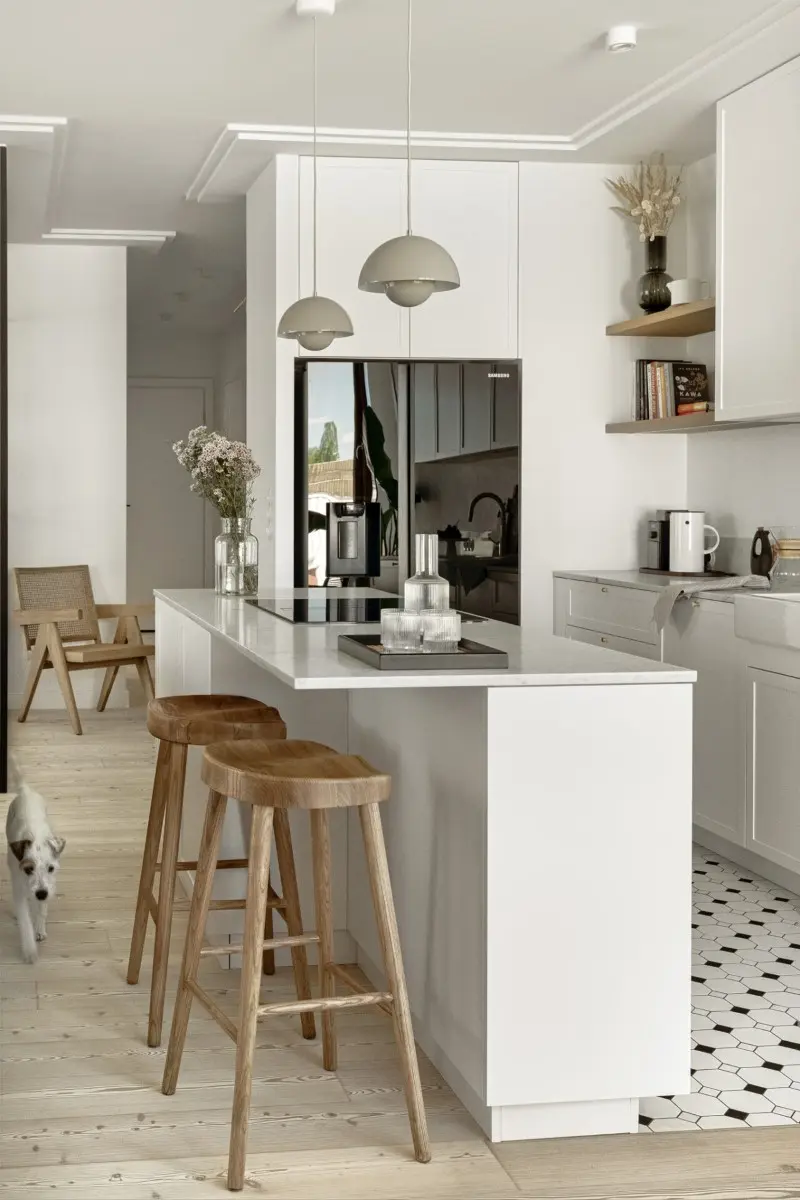 W białej kuchni w stylu skandynawskim doskonale sprawdzą się otwarte półki, na których z łatwością wyeksponujemy ulubioną zastawę, albo zioła w ozdobnych doniczkach, czy inną roślinność, będącą ponadczasową dekoracją wnętrza.