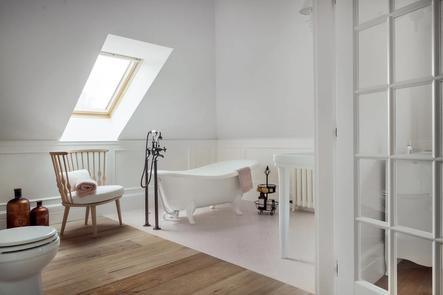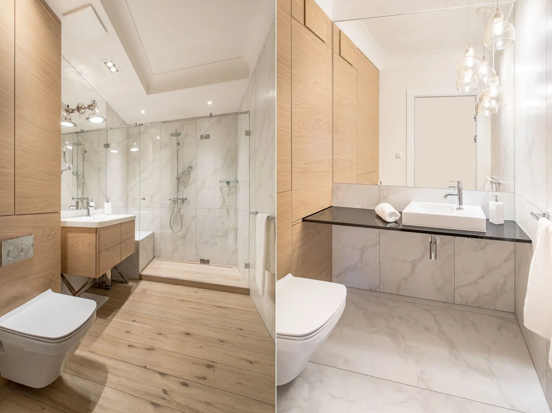 W przestronnych wnętrzach duet bieli i drewna zyskuje na sile poprzez możliwość zabawy proporcjami. Możemy zastosować kontrastowe zestawienia – np. śnieżnobiałe kafle z wyrazistym rysunkiem drewna – tworząc łazienkę w stylu skandynawskim, japandi, a nawet modern rustic. Duży metraż pozwala również na wykorzystanie strukturalnych płytek lub dekoracyjnych mozaik, które nadają ścianom głębi.