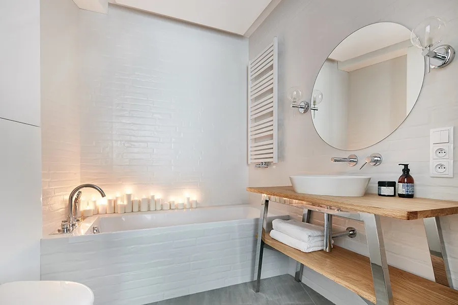 Estetyka bazująca na bieli i drewnie jest odporna na zmieniające się trendy. To zestawienie neutralne, ale jednocześnie wyraziste – łatwe do uzupełnienia o modne dodatki: czarne baterie, złote akcenty, rośliny czy organiczne formy ceramiki. Dzięki temu łatwo można je odświeżyć bez kosztownego remontu.