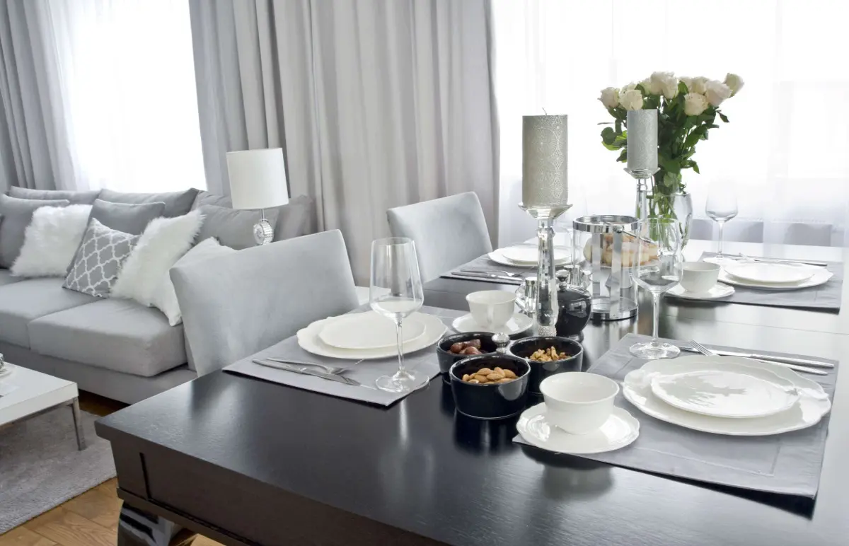 W jadalni wystarczy kilka błyszczących dodatków w postaci świeczników, miseczek czy piękny bukiet świeżych kwiatów, a nasze wnętrze stanie się bardziej kobiece i glam.