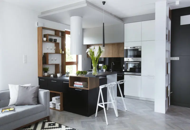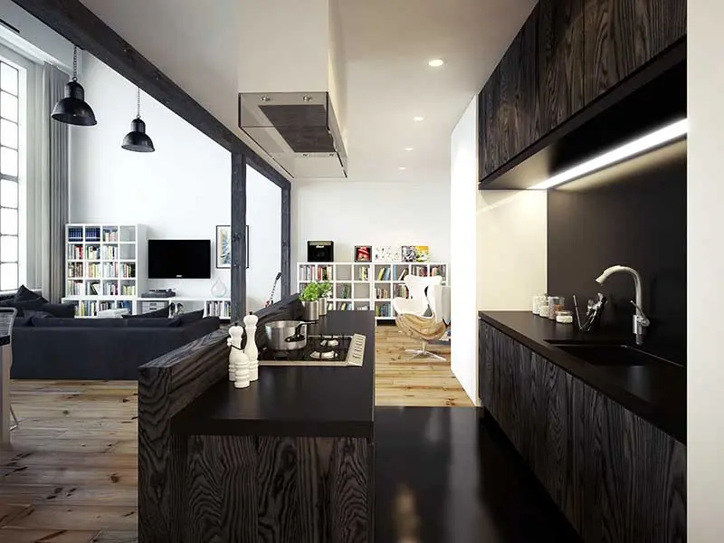 Wyjątkowo prezentują się również kuchnie wykonane owszem z czarnego materiału, ale gdy jest nim surowe drewno. Pod cienką warstwą farby, bądź lakieru widać naturalne słoje drewna, z którego szafki zostały wykonane. Do tego gładki w barwie blat i minimalizm panujący w całym pomieszczeniu, a projekt stanie się wręcz hipnotyzujący.