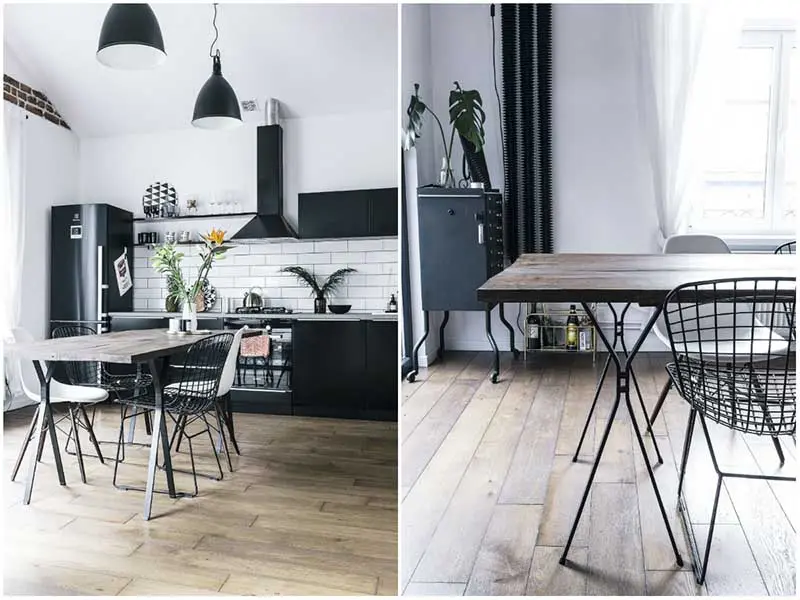 Przede wszystkim pamiętajcie, że w żadnym wypadku w momencie aranżowania przestrzeni kuchennej nie jesteście zmuszeni do używania wyłącznie glazurowych, bądź gresowych płytek. Co prawda, są one wygodną alternatywą, ale jeśli zależy nam na stworzeniu cieplejszej przestrzeni, to warto postawić po prostu na drewno. Co zaś do ściany nad blatem świetnie sprawdzą się kafelkowe w kształcie płytki. Z ciemną fugą wyglądać będą na wspaniałe podstarzałe wykończenie z charakterem.