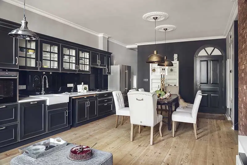 Co pewnie będzie zaskoczeniem dla wielu z Was, czarne szafki odnajdą się również w klasycyzujących stylem kuchniach. Żłobienia we frontach i szklane witryny w górnych meblach wspaniale się ze sobą komponują. Do tego, jeśli pomieszczenie, którym dysponujecie ma pokaźne okna, a co za tym idzie fantastyczne oświetlenie, to efekt będzie murowany. Dobrze jednak w takim przypadku postawić na jasną barwę materiału, z którego zrobiony będzie blat. Zastanówcie się nad białym, bądź beżowym kamieniem.