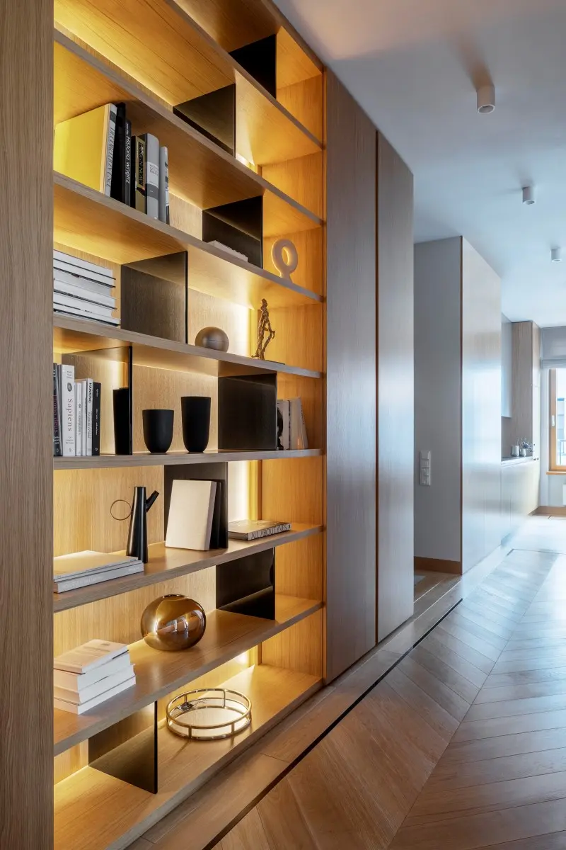 Elementem, który wzbogaci wizualnie regał na książki jest punktowe oświetlenie. Ciekawy przykład znajdziecie w poniższym projekcie.