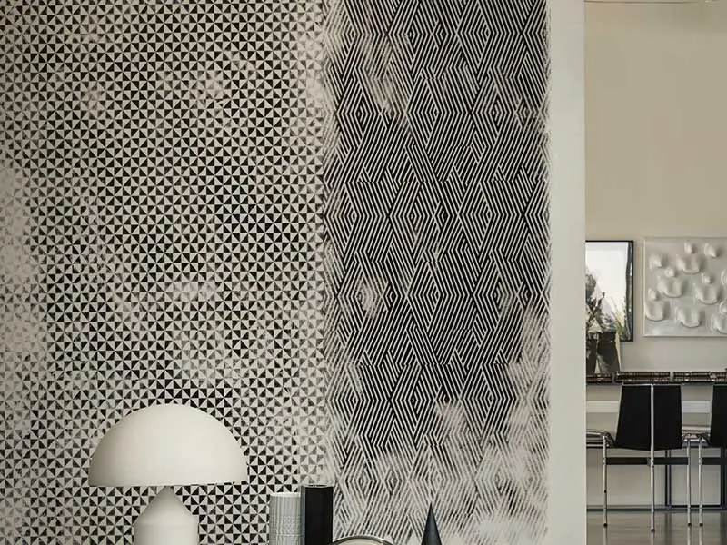 Szukacie czegoś bardziej oryginalnego? Loft to nie tylko beton i cegła. Warto poszukać własnej inspiracji, która podkreśli piękno otwartej przestrzeni. Wybór odpowiedniej tapety jest o tyle istotny, że ściany w loftach są mocno wyeksponowane i stanowią trzon całej aranżacji. Na następnym zdjęciu mamy propozycję dla miłośników iluzji. Tapeta od Wall & Deco z serii Vibrante, inspirowana czarno-białą geometrią. Wzór wygląda, jakby był namalowany na ścianie, dzięki czemu całość wygląda bardzo efektownie.