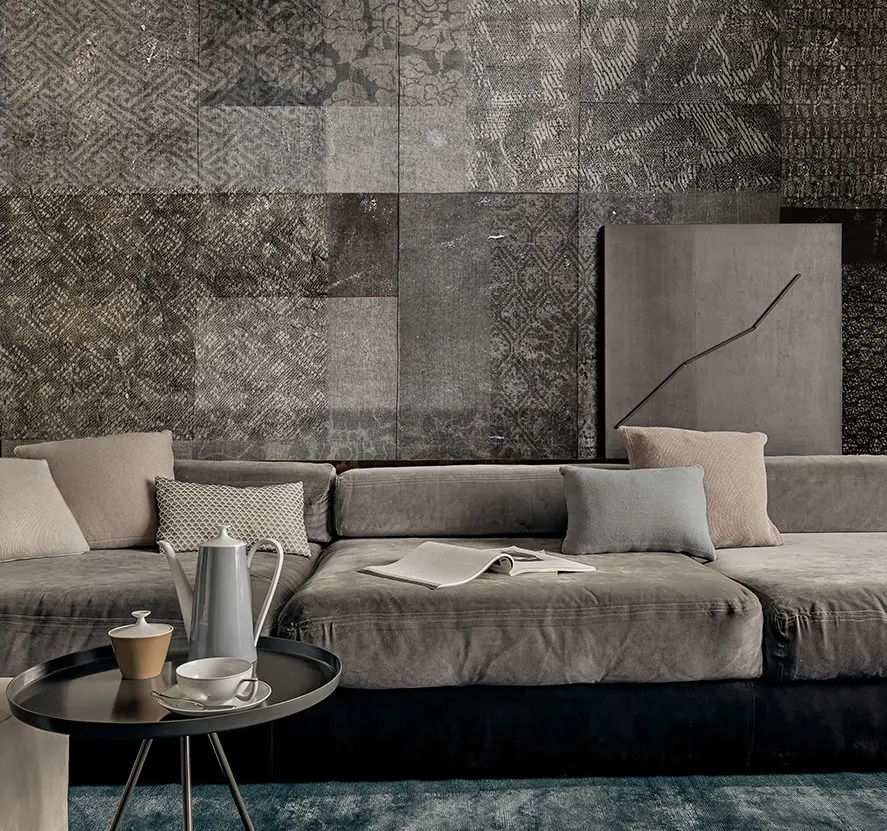 Tapeta naśladująca betonowy patchwork w zestawieniu z eleganckim zestawem wypoczynkowym. Wykończenie aranżacji stanowi wyjątkowy dywan i zestaw poduszek dekoracyjnych.