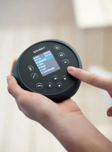 Do sterowania sauny Inipi służy specjalny pilot z wyświetlaczem stylizowany na kształt kamienia. Designerska forma pilota doskonale komponuje się z estetyką całego zestawu. Oprócz wyboru zakodowanych programów, możemy tworzyć również własne, sterując takimi parametrami jak temperatura, wilgotność powietrza, kolor światła i dźwięk.