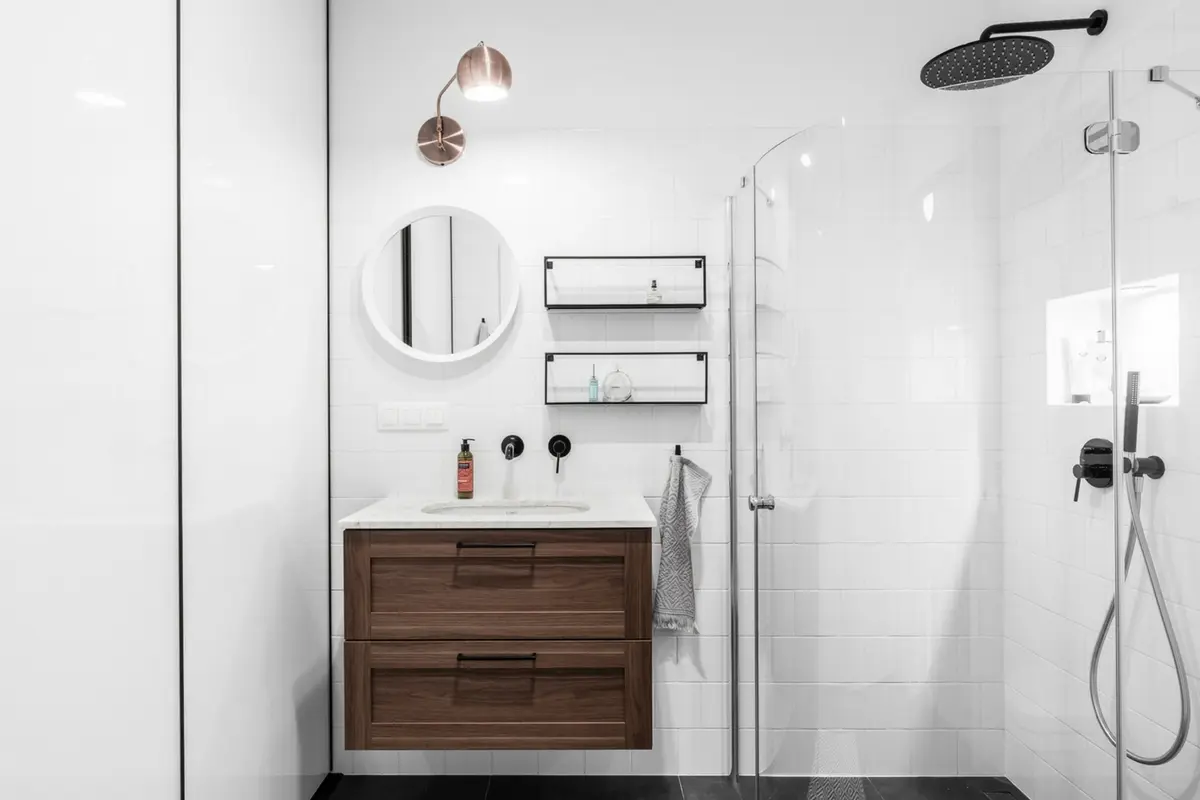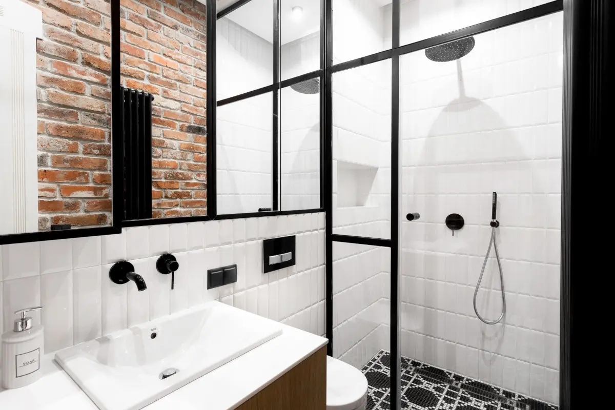Równie dobrze sprawdzą się tradycyjne kafle, czyli tak zwane płytki metro. Ciekawym zabiegiem jest ułożenie ich tylko w najbardziej newralgicznych miejscach, gdzie mają bezpośrednią styczność z wodą. Resztę ścian możemy pomalować na ciekawy kolor, na przykład szarość, grafit, granat a nawet czerń.