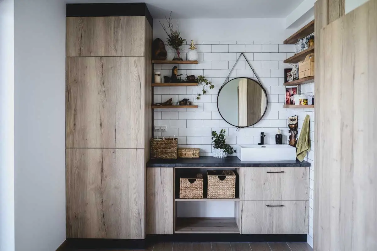 Jeśli zastanawiasz się jaką szafkę pod umywalkę wybrać, najlepiej postaw na mebel z duszą. Może to być komoda vintage na nóżkach, albo prosty blat na metalowym stelażu. Najważniejsze, aby mebel był wykonany z naturalnego drewna, które możemy podkreślić na przykład metalowymi zawiasami, których oczywiście nie chowamy lecz bez kompleksów eksponujemy. Może to być również szafka zbita z desek. Takim elementem na pewno wzbogacimy aranżację naszej łazienki!