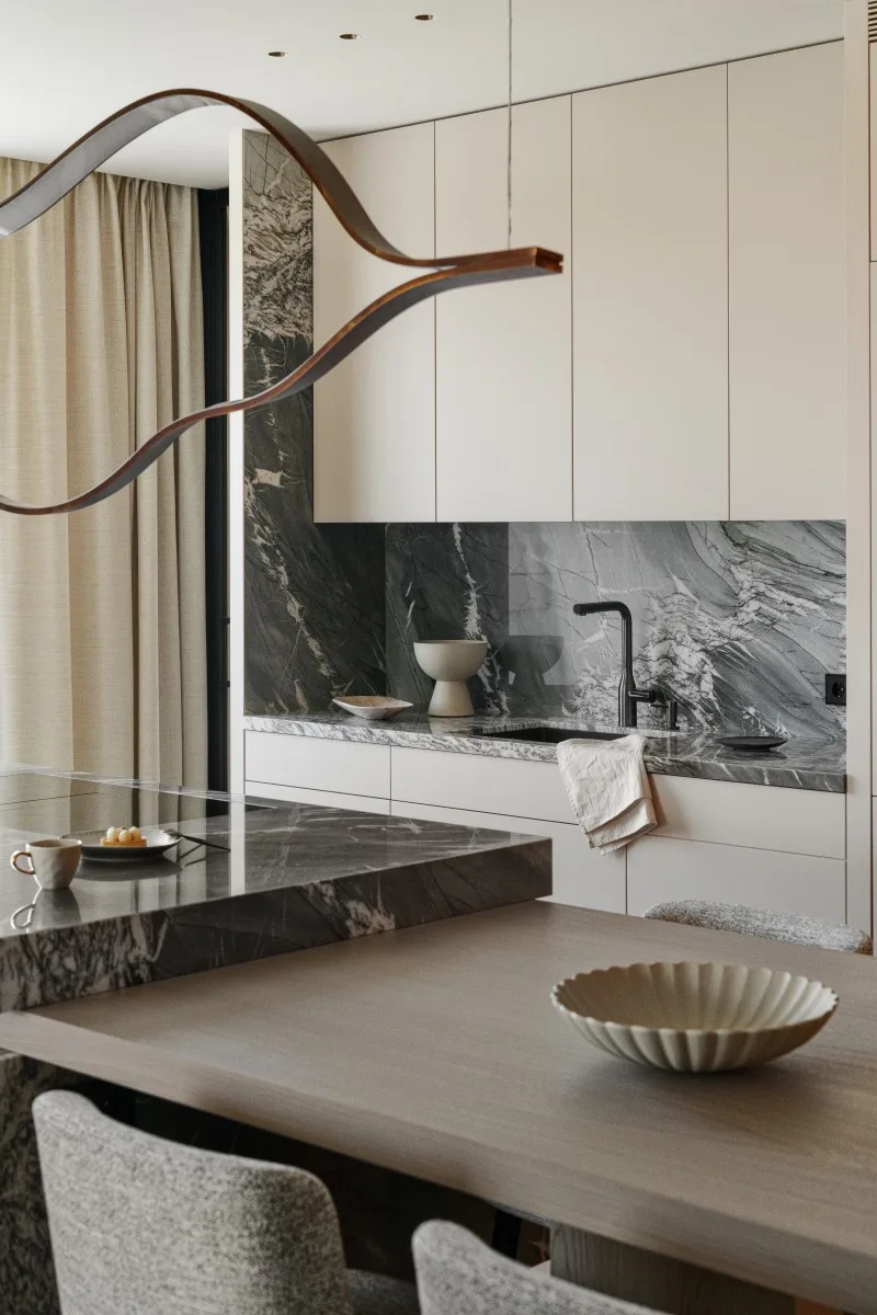 Warto pochować wszystkie sprzęty kuchenne, które nie wymagają eksponowania na blacie, a zamiast tego postawić na bardziej dekoracyjne elementy, na przykład ozdobne uchwyty meblowe czy elegancką armaturę w kolorze złota lub miedzi.