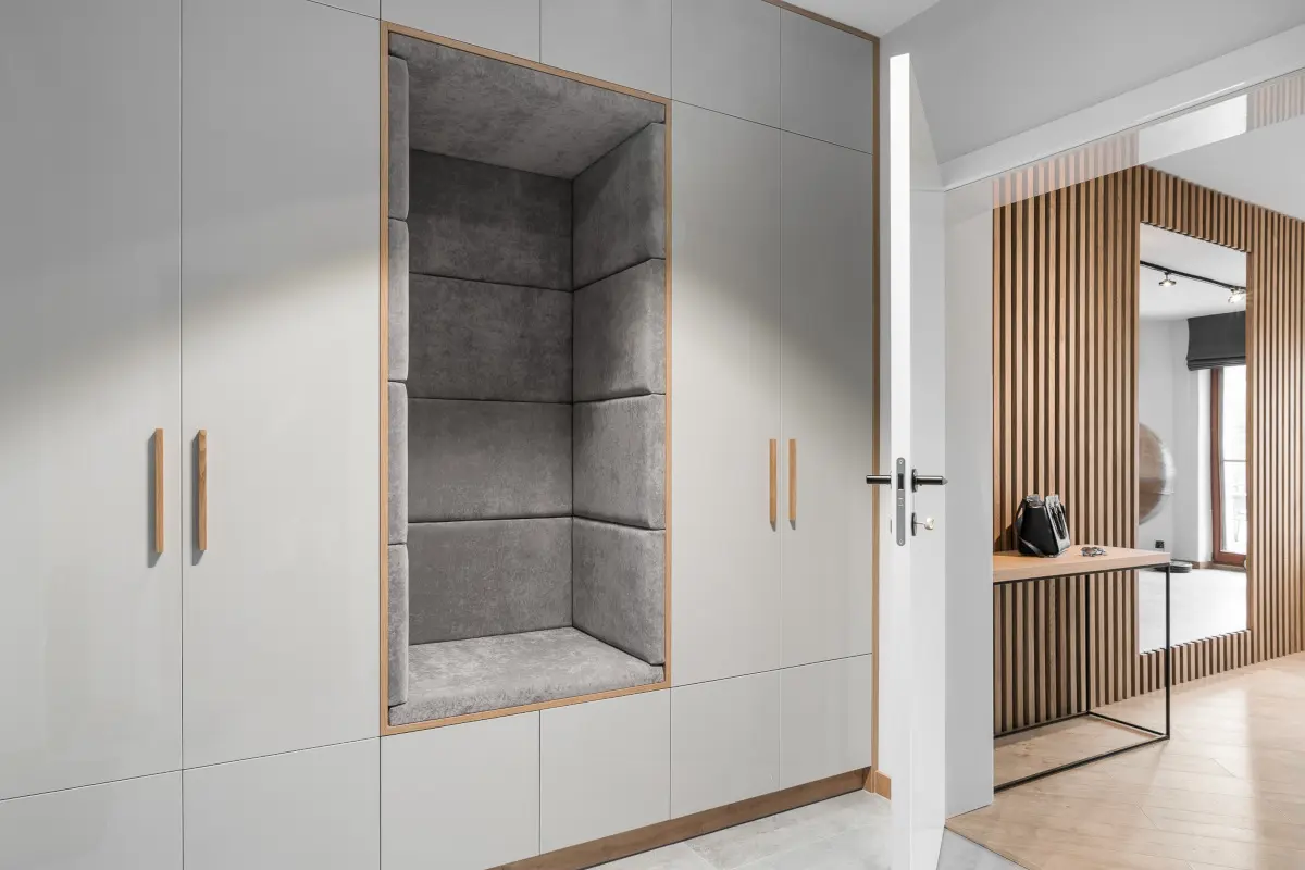 Nie zapominajmy o tym, że ważnym (jak nie najważniejszym) elementem aranżacyjnym ściany w przedpokoju jest miejsce przeznaczone do przechowywania. W nowocześnie urządzonych wnętrzach powinniśmy zadbać o to, aby szafa wnękowa była zrobiona pod wymiar, tak aby maksymalnie wykorzystać potencjał pomieszczenia oraz dopasować ją do stylu holu.