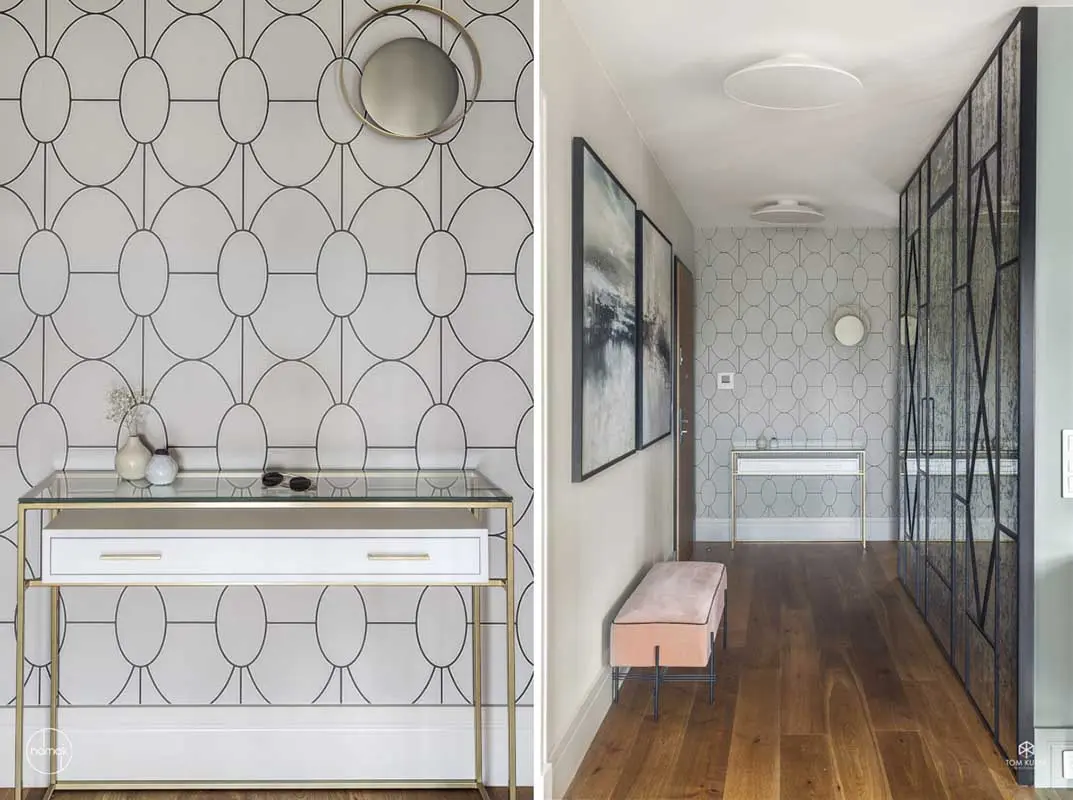 Bardzo ciekawą propozycją są tapety. W naszych showroomach znajdziecie ogromny wybór rodzajów, wzorów, tłoczeń i kolorów od najlepszych brandów (m. in. Cole & Son, Arte, Wall & Deco). Tapety dzięki swojej dekoracyjnej formie sprawią, że przedpokój bez naszego większego wysiłku będzie prezentował się nienagannie. Niektórzy nawet zarzucają architektom, że gdy używają w projektach tapety, idą na łatwiznę, bo za ich pomocą najłatwiej osiągnąć spektakularny efekt.
