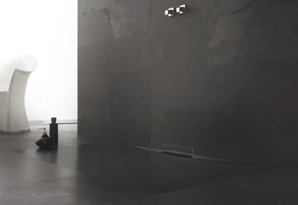 Płaski czarny brodzik Kaldewei Xetis, zlicowany z powierzchnią podłogi, to spełnienie marzeń każdego, kto pragnie stworzyć wrażenie prysznicu bez brodzika. Przy zastosowaniu nowoczesnych płytek, które kolorystycznie zlewają się z Xentisem, osiągamy płaską powierzchnię, będącą w pełni funkcjonalną częścią strefy prysznicowej eleganckiej łazienki w kolorze czarnym.