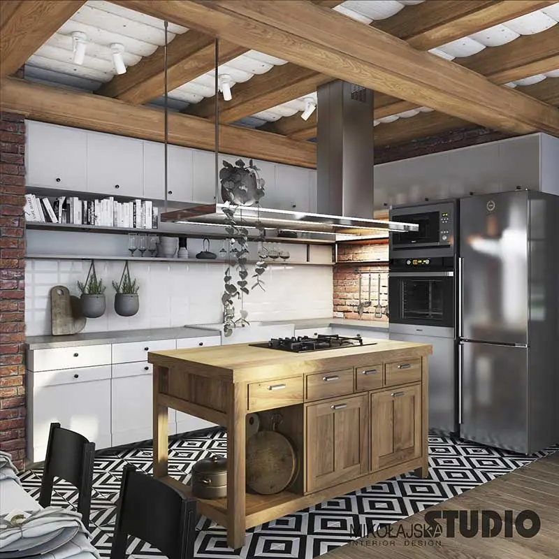 Odważni zestawią płytki i drewno w oparciu o jak największy kontrast barw i wzorów. I dobrze! Wszystkie chwyty dozwolone. Wersja czarno-biała płytek mozaikowych sprawdzi się z większością gatunków drewna. Jeśli jednak wolicie rozwiązania stonowane i bezpieczne – wybierzcie płytki dopasowane kolorystycznie do reszty kuchennej posadzki. To również się sprawdzi.