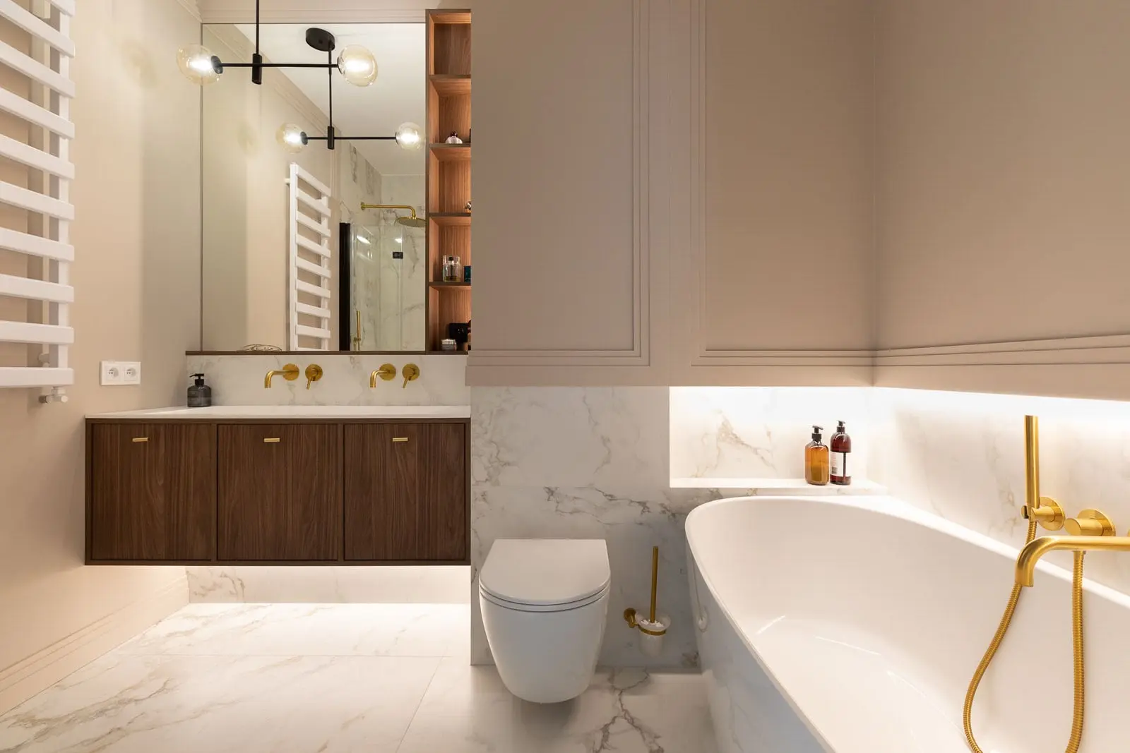 Przed Państwem kolejna łazienka, w której elementem fokusowym jest złota armatura. Tym razem jednak tłem dlań jest biel w złamanym, beżowym kolorze. Dzięki takiego zabiegowi, architektom (Pracownia Metr Po Metrze) udało się stworzyć bardzo przytulny azyl. Efekt ten potęguje drewno w ciepłym kolorze orzecha. Spoiwem łączącym wszystkie materiały i kolory są płytki marmurowe z delikatnym żyłowaniem.