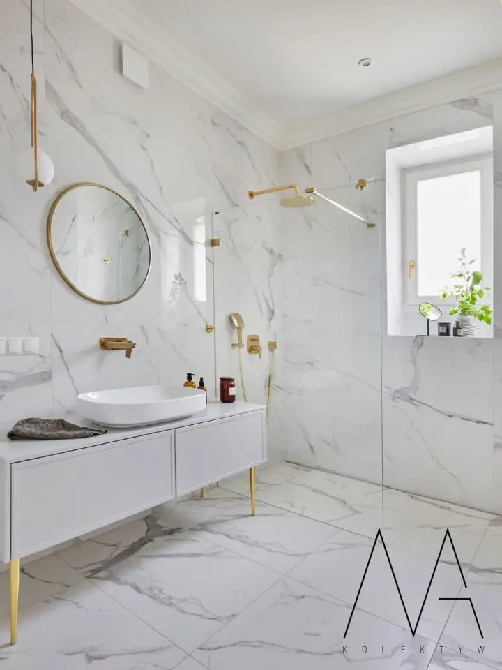 Minimalizm właśnie ukazał przed nami swoje ekskluzywne oblicze. Płytki z rysunkiem szlachetnego kamienia stworzyły piękne tło dla aranżacji salonu kąpielowego zaprojektowanego przez M.A. Kolektyw. Biżuterią, która spełnia jednocześnie konkretne funkcje, jest złota armatura. Kompozycyjną czystość wyraża strefa prysznicowa zaprojektowana za minimalistycznym szklanym przepierzeniem.