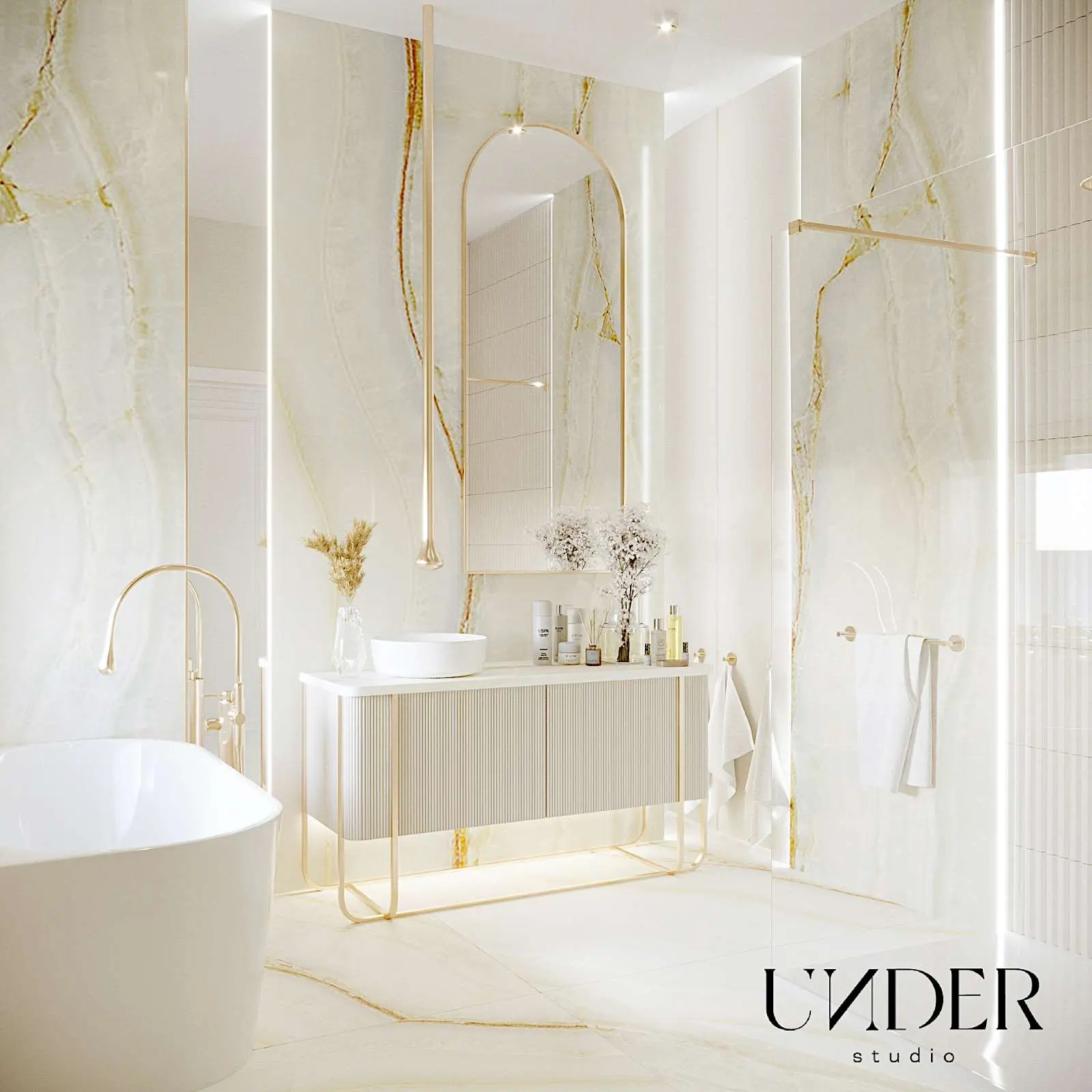 Przyszła kolej na wytworną oraz pełną blasku łazienkę, do której architekt Agnieszka Kułakowska wybrała białą elegancką płytkę z mocnym złotym żyłowaniem, przypominającym szlachetny alabaster. W projekcie zwraca uwagę również złota armatura marki Gessi, w szczególności duże wrażenie robią zainstalowane sufitowo wylewki dopełniające aranżację strefy umywalkowej. Całość uzupełnia efektowne lustro w kształcie łuku oraz elegancka szafka umywalkowa z ryflowanymi frontami.