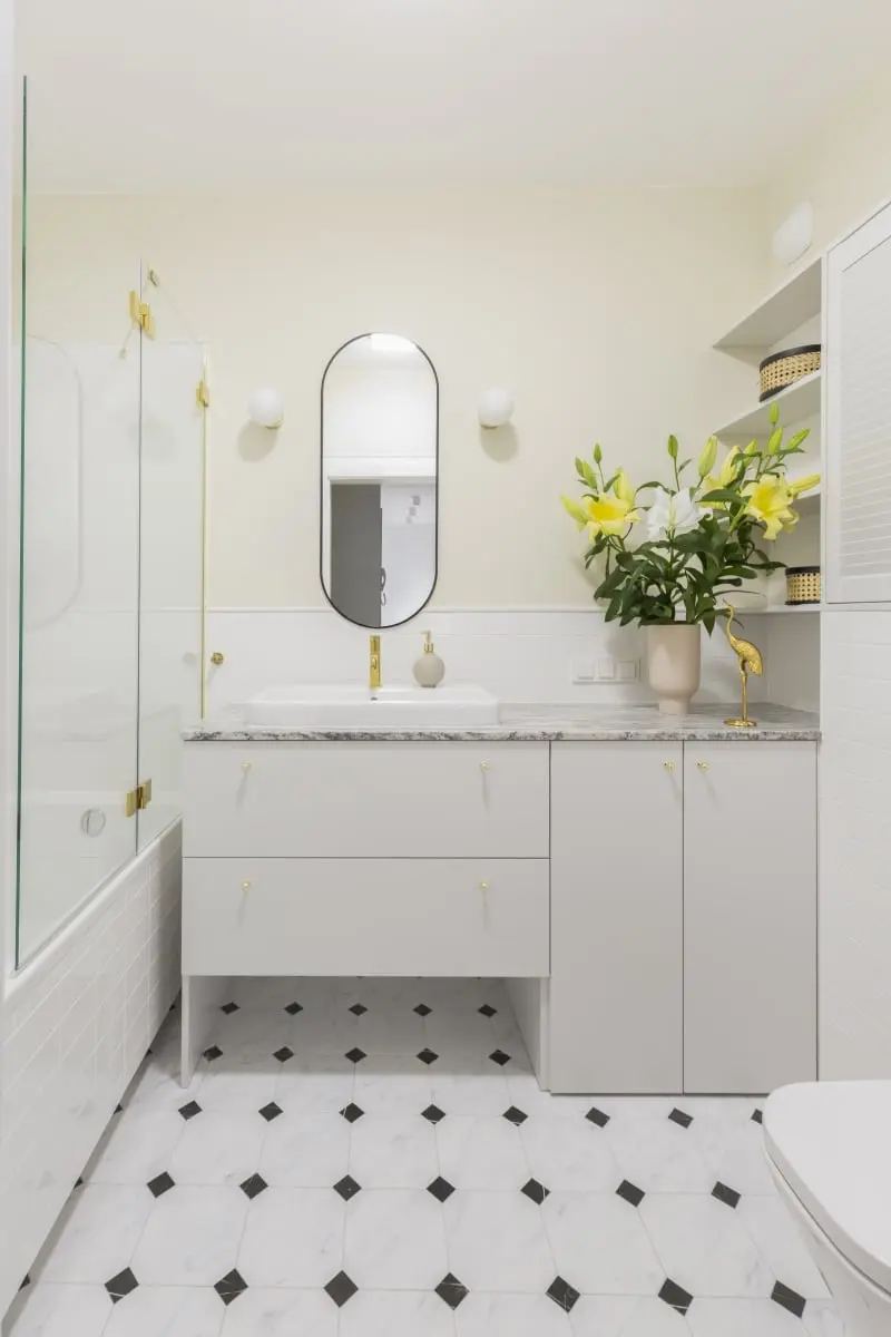 Pomimo małych gabarytów, tę łazienkę zaprojektowaną przez Pracownię Nasze Nowe, możemy nazwać eleganckim salonem kąpielowym. Podłogę pokrywają białe płytki z czarnymi aplikacjami, a na ściany w części górnej wybrano farbę o jasnocytrynowym kolorze. Natomiast dolną cześć dekoruje lamperia w postaci białych cegiełek zwieńczonych dekorem. Pojemna zabudowa podumywalkowa ukrywa miejsce na pralkę. Blat wykończono szarym granitem, który pięknie współgra z optymistyczną cytrynką. Zabudowana wanna umożliwia relaksujące kąpiele, ale dzięki szklanemu parawanowi spełnia również rolę prysznica. Aranżację łazienki uzupełnia złota armatura.