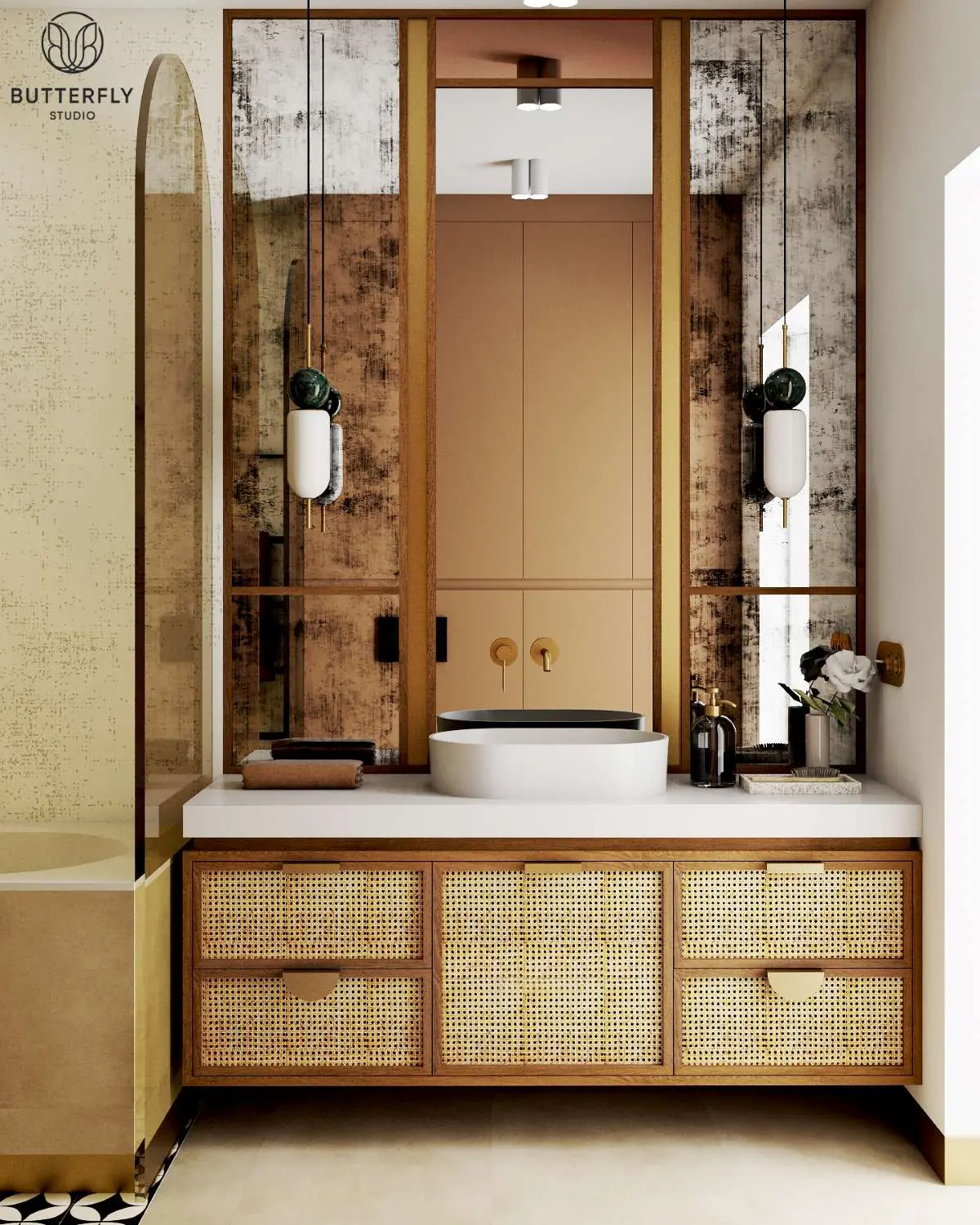 Projekt Butterfly Studio to jedna z najbardziej nieoczywistych aranżacji zaprezentowanych w tym wpisie. To tu wpływy orientu łączą się ze stylem boho. A wszystko to ma szansę na drugie życie w odbiciu postarzanych luster zastosowanych w strefie umywalkowej. Kropką nad ,,i” są baterie w kolorze brushed gold. Ciekawą przeciwwagą dla rattanowych frontów oraz ciepłych i łukowatych przepierzeń są wzorzyste czarno – białe płytki wydzielające strefę kąpielową.