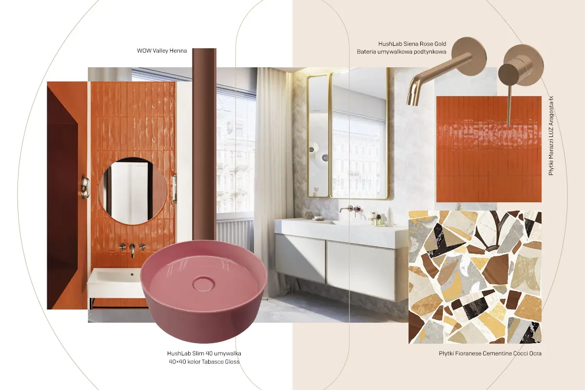 W przypadku łazienek, które ma się ochotę ,,jeść oczami” często puntem wyjścia jest jeden produkt, który podbija nasze serce. Reszta stanowi piękne dopełnienie. Czasami jest to kolekcja płytek, które wyglądają jak ciasteczka z kremem, innym razem różowa umywalka, albo tapeta. Tutaj mamy do czynienia z efektem domina. Jeden element stanowi kontynuację drugiego. Łatwo to sobie wyobrazić na przykładzie moodboardu, który układamy zanim wyobrażenie stanie się rzeczywistością. Z naszego doświadczenia wiemy, że dobieranie kolorów, łączenie wzorów i tekstur do momentu, aż otrzymamy satysfakcjonujący efekt, to jeden z ulubionych etapów pracy z projektantem wnętrz.