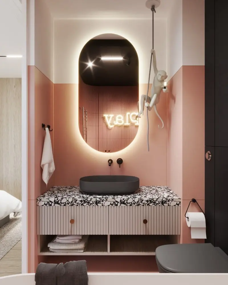 Delikatny jak chmurka przybrudzony róż w towarzystwie czarnej ceramiki i armatury oraz charakternego lastryko, zyskuje zupełnie nowe oblicze. Do tego zabawna lampa włoskiej manufaktury i modny neonowy napis będący swojego rodzaju mottem przyświecającym projektowi. Twórczy sprzeciw wobec triumfującej bieli w małych łazienkach, przełożył się na powstanie wnętrza, które dumnie wymyka się schematom.