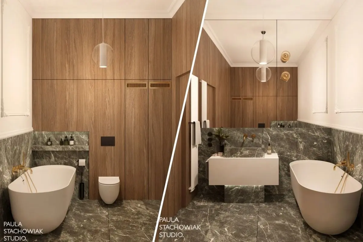 Wanna wolnostojąca, płytki imitujące marmur i złota armatura – te elementy razem stworzyły niezwykle luksusową przestrzeń. Stonowana kolorystyka, którą dodatkowo ociepla drewno w dębowym odcieniu, sprawia że wnętrze otula przytulną aurą oraz przybliża nas do wartości ponadczasowej, jaką jest życie w bliskości z naturą.