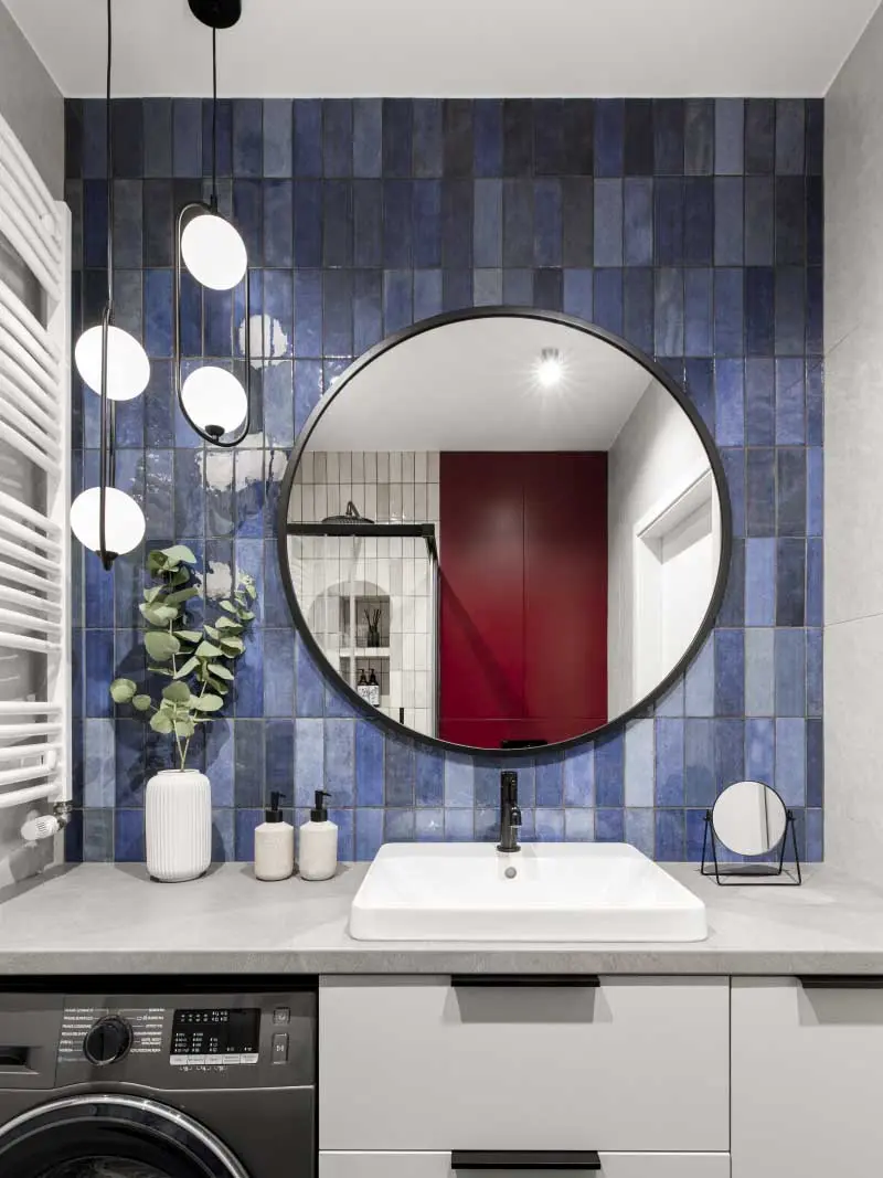 Poniższe realizacje mają ze sobą coś wspólnego, co wygląda na receptę urządzenia pięknej łazienki z widoczną pralką. Jak widzimy, architekci dość wyrazistą aranżacją próbują odwrócić od niej uwagę. Kombinują z nasyconym kolorem czy ciekawą ceramiką. Całość dopieszczają designerskim oświetleniem i armaturą. Nie brakuje tu ciekawych rozwiązań projektowych, jak stylowe lamperie czy łączenie różnych kierunków oraz przedmiotów zacierających granice czasu.