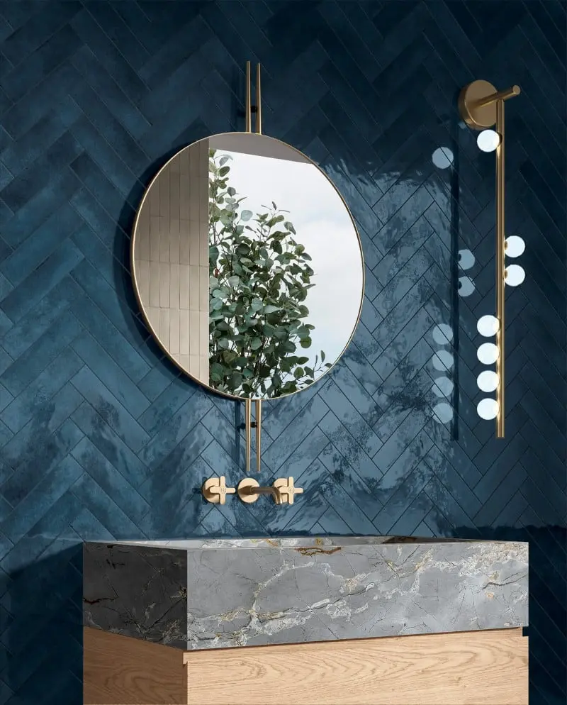 Ten projekt łazienki udowadnia, że jodełka świetnie się sprawdza nawet w małych pomieszczeniach. Płytki ułożone w ten sposób wizualnie podwyższają wnętrze, optycznie powiększając je. Ten efekt potęguje lustro.