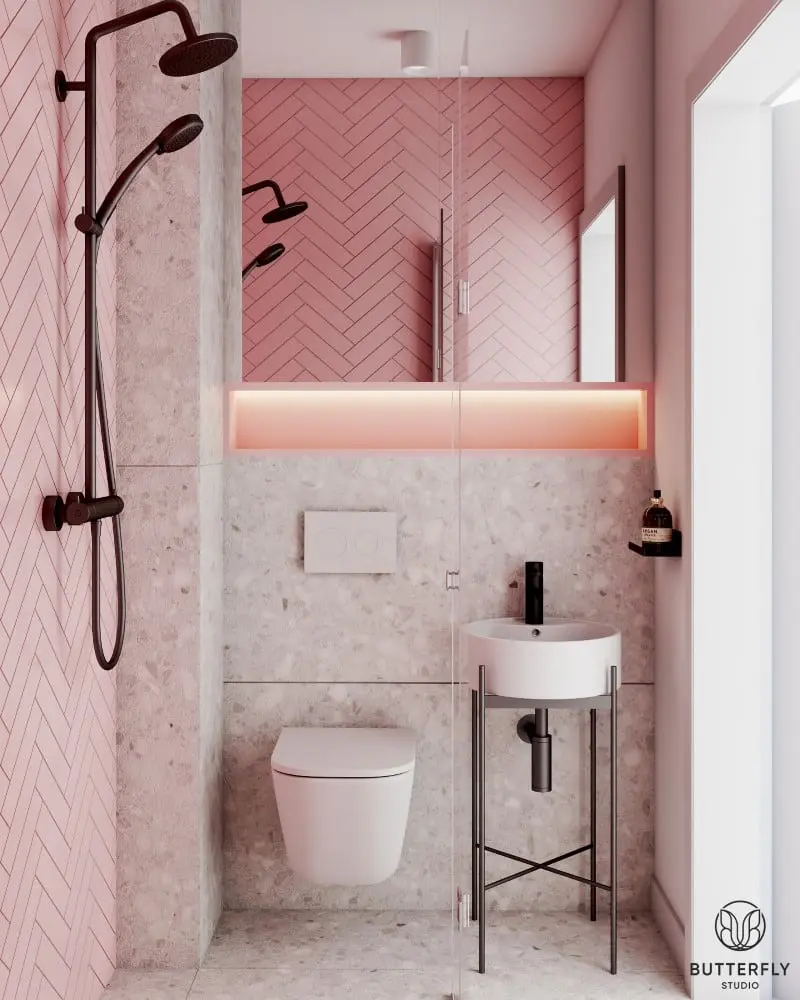 Tym razem prezentujemy łazienkę z różową jodełką w zestawieniu z czarną armaturą z serii Lukka polskiej marki HushLab. Całość tonują płytki w lastryko utrzymane w subtelnych szarościach. To wnętrze udowadnia, że nawet przy małym metrażu, możemy zaszaleć z formą i kolorem. Wystarczy wiedzieć, jakich środków użyć, żeby nie przesadzić. Lekkości aranżacji nadaje stelaż pod umywalkę – idealny do małych pomieszczeń.