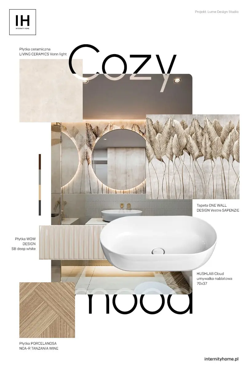 Tapeta w łazience to jeden z najlepszych sposobów na wyczarowanie nietuzinkowego projektu wnętrza. W tym przypadku architektka Karolina Michalkiewicz-Kasina (Lumè design studio) postawiła na florystyczny wzór utrzymany jednak w stonowanej beżowej kolorystyce, idealnie dopasowanej do całego wnętrza. Kremową tonację rozświetlają szlachetne akcenty złota. Bazę stanowią beżowe płytki uzupełnione drewnopodobnym dekorem. Przytulny wystrój podkreślają obłe formy ceramiki łazienkowej. Architektka wybrała z naszej oferty umywalkę Cloud oraz miskę wc wiszącą Calm polskiej marki HushLab.
