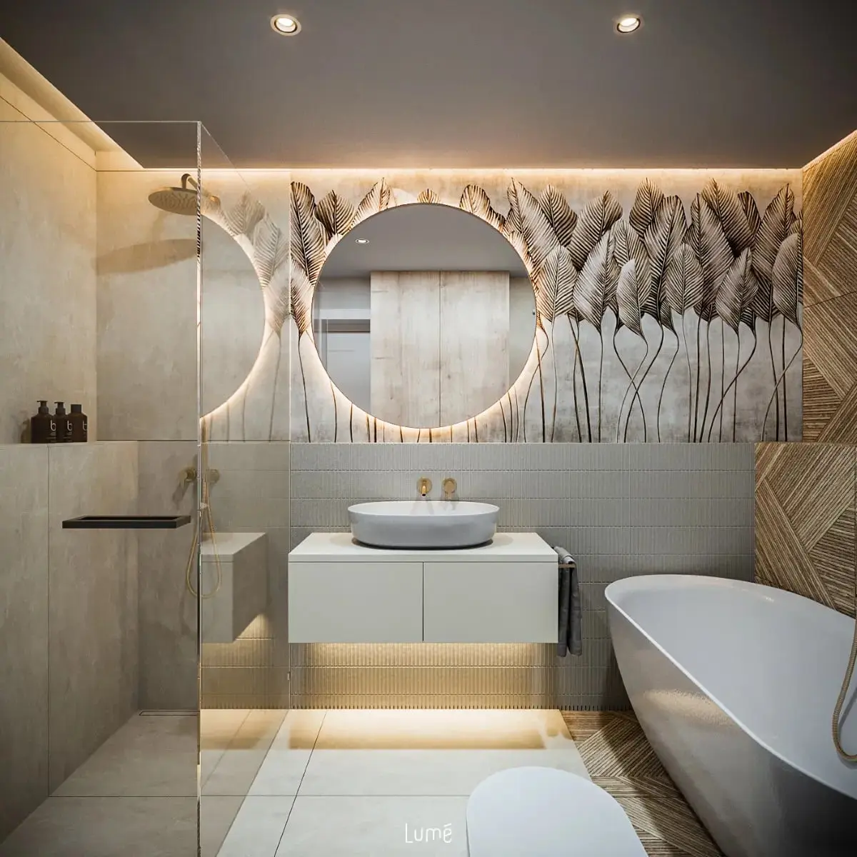 W dzisiejszym wpisie zaprezentujemy projekt wnętrza, który choć nie imponuje dużym metrażem, spokojnie możemy nazwać pokojem kąpielowym. Jego punktem fokusowym jest tapeta, którą dopełniają płytki o zróżnicowanych teksturach. Ciepłe światło, akcenty złota oraz organiczne formy sprawiają, że przestrzeń ta ujmuje niezwykle przytulną atmosferą, zachęcającą do sprawiania sobie drobnych przyjemności w domowym zaciszu.