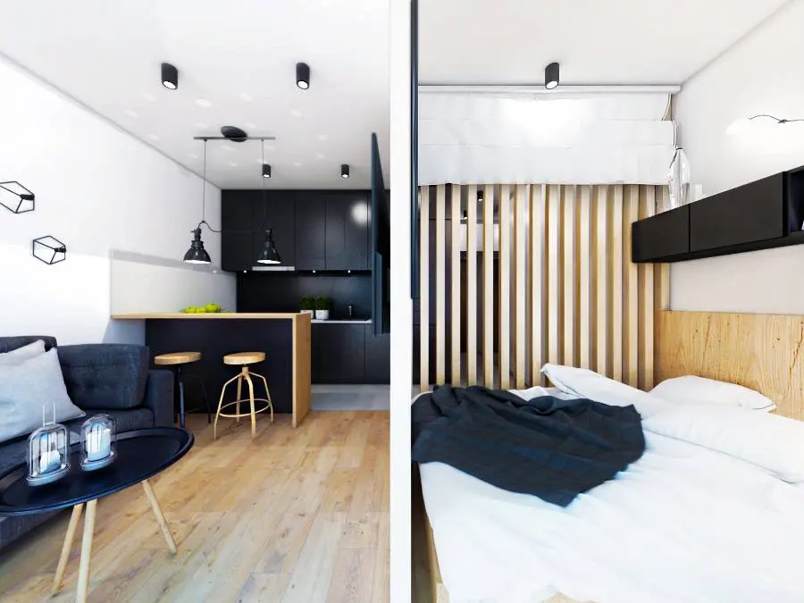Pracownia Spacja Studio: Prawdziwą sztuką jest łączenie pomieszczeń tak, by posiadały wyraźny podział jednocześnie nie przytłaczając metrażu ścianami i umeblowaniem. Mistrzem w tej kwestii jest pracownia Spacja Studio, która w kawalerkach znajduje miejsce nawet na dodatkowy kącik na jadalne, a tworząc lekkie meblościanki w projektach ukrywają dodatkowe miejsce na przechowywanie. Genialnym w tym projekcie jest wyodrębnienie na tak małym metrażu – sypialni. Tak, ukryta jest w szafie razem z miejscem do pracy.