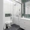 Bardzo mały metraż wymusza na nas pójście na pewne kompromisy. Stąd też konieczność połączenia miejsca do kąpieli, które zazwyczaj dzieli się na wannę i strefę prysznicową. Tutaj dzięki zastosowaniu kompaktowej wanny, oraz nowoczesnej deszczownicy połączonej z baterią wannową, tworzymy kompleksowe rozwiązanie strefy kąpielowej. Możemy także zamontować dodatkowo funkcjonalny panel prysznicowy, aby dać jeszcze więcej możliwości w kategorii swobody kąpieli.