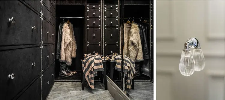 PROJEKT: Fabryka Wnętrz W garderobie, jak i w innych pomieszczeniach ogromną rolę grają dodatki. Jeśli więc zależy nam na stworzeniu nietypowego wnętrza połączmy z sobą nietypowe faktury i formy. Co powiecie na zestaw: kryształowe szkło, kamień i welur? Brzmi kosmicznie, ale efekt jest powalający! Do tego, jeśli dysponujecie wyłącznie niewielkim pomieszczeniem, a chcielibyście wizualnie je nieco powiększyć zdecydujecie się na duże lustro na jednej ze ścian. Jest ono niezbędne w garderobie, a odbijając wnętrze nieco je pogłębi.