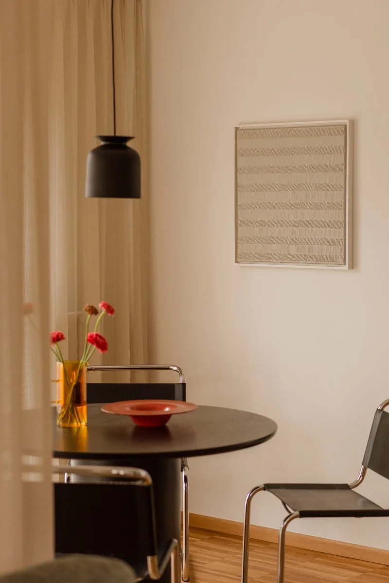 Małe mieszkania wymagają od nas dużej ostrożności… i wcale nie chodzi mi o sposób poruszania się, który za sprawą dużej ilości przedmiotów, bardziej przypomina tor przeszkód, aniżeli komfortowe przechadzanie się po mieszkanku. Mam na myśli aranżację, w której przede wszystkim nie możemy przesadzić ze zbyt dużą ilością bibelotów. Ponadto na dobre wyjdzie nam unikanie mocnych dekorów czy nasyconych kolorów. Sprawa tyczy się również doboru mebli jadalnianych. Tak, jak wspomniałam we wstępie, zachęcam do eksperymentów.