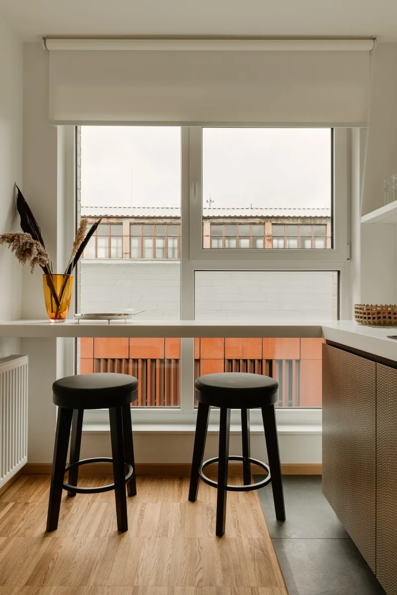 Kolejną możliwością jest przedłużony blat kuchenny, który z powodzeniem może pełnić funkcję stołu. Taki blat możemy umieścić, na przykład przy oknie zamiast parapetu.