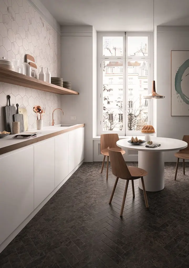 Wśród najpiękniejszych przykładów współczesnego włoskiego minimalizmu znajduje się kuchnia wykończona płytkami marmurowymi z kolekcji Allmarble od Marazzi. To propozycja, która zachwyca swoją prostotą i jednocześnie bije od niej nieskazitelna elegancja. Subtelne użylenia, matowe wykończenia i dopracowana forma sprawiają, że przestrzeń nabiera szlachetności, nie tracąc przy tym funkcjonalności. To wnętrze, które nie potrzebuje nadmiaru — bo siła tkwi w harmonii.