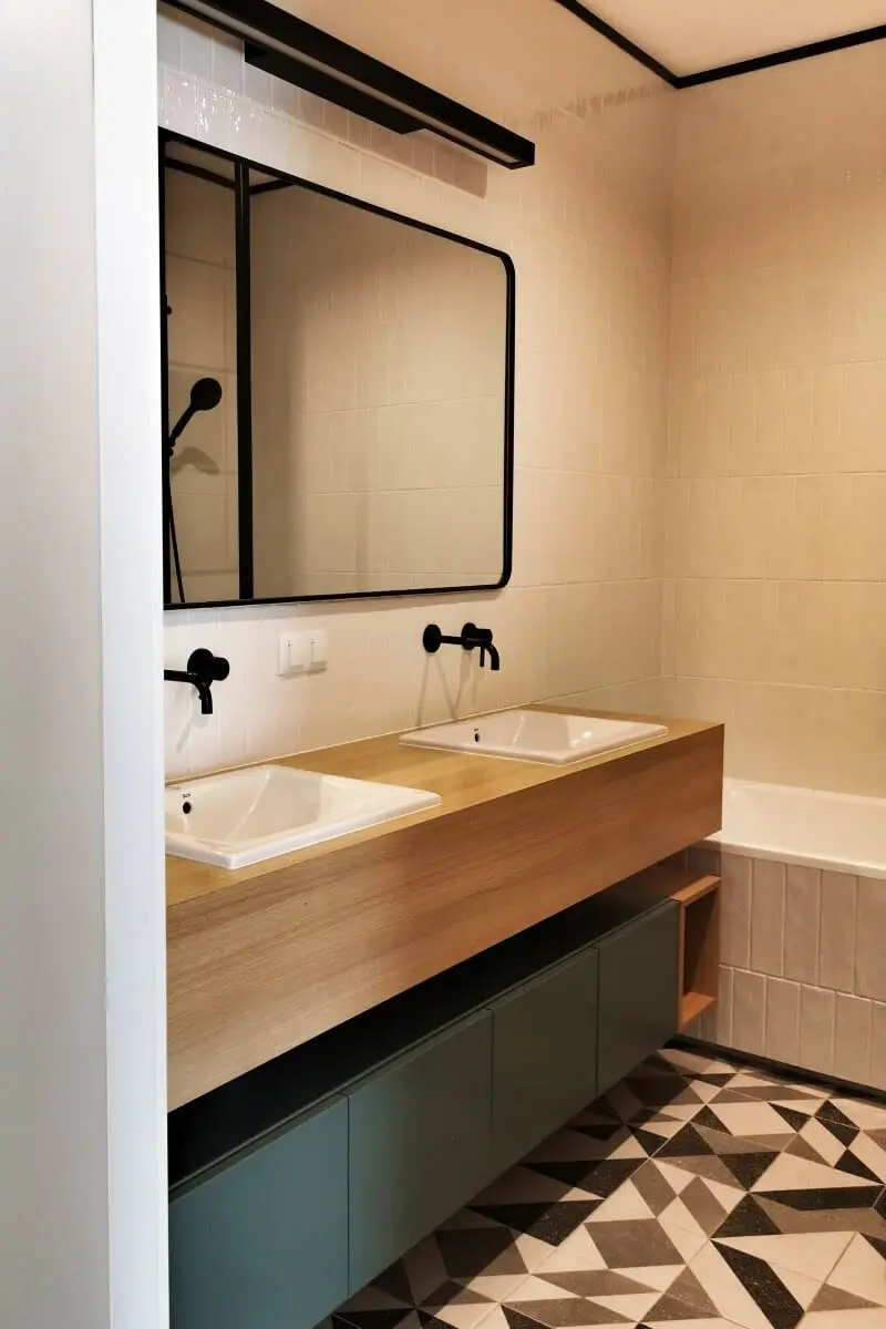 Duża łazienka daje właścicielowi wiele możliwości zaplanowania przestrzeni i pozwala puścić wodze fantazji. Można pokusić się o zastosowanie ciemnych barw z jasnymi dodatkami – armaturą, dekorami, meblami lub zdecydować się na pastele. Duże pomieszczenia lubią kontrastowe zestawienia i geometryczne wzory. W palecie ciemnych barw nie może zabraknąć butelkowej zieleni i kobaltu, które doskonale komponują się z modnym lastryko. W zestawieniu z podłogą z drobinkami kamienia świetnie prezentują się także złoto i pudrowy róż. Bardzo popularne jest obecnie łączenie lastryko z pastelowym różem, zielenią, kolorem żółtym, niebieskim czy pomarańczowym. Modne barwy i wzory, wśród nich m.in. motywy marmuru i patchworku, warto wykorzystać do podkreślenia podziału dużej łazienki na poszczególne strefy funkcjonalne – wyróżnić je wspomnianym odmiennym kolorem lub ornamentem. Aranżując rodzinną łazienkę, nie można pominąć istotnych dodatków: wieszaków na ręczniki (w liczbie takiej, by każdy z domowników mógł mieć własny), dopasowanych do stylu wnętrza akcesoriów, jak: mydelniczki, dozowniki do mydła, kubeczki (najlepiej ceramiczne). Trzeba pamiętać też o takich usprawnieniach, jak choćby baterie wyposażone w perlatory, które pomagają oszczędzać wodę. W przypadku dużej rodziny ma to ogromne znaczenie. By realizacja dużej łazienki zakończyła się sukcesem, trzeba zadbać o każdy detal.